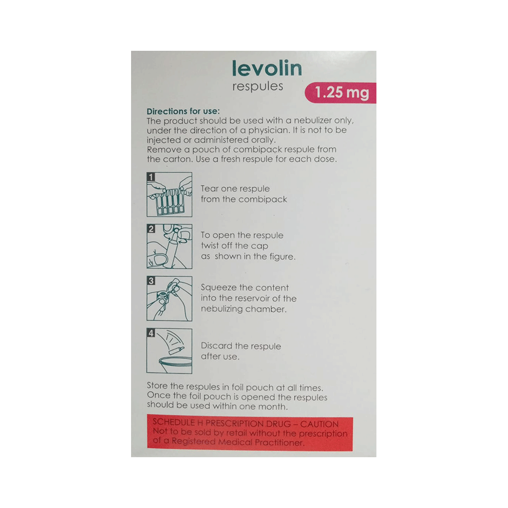 Levolin 1.25mg Respules is a belongs to a group of medicines called fast-acting bronchodilators or relievers. It is used to treat the symptoms of asthma and chronic obstructive pulmonary disease (COPD) such as coughing, wheezing, and feeling short of breath. Levolin 1.25mg Respules gives quick relief from breathing problems when you need it. In most cases, you will be given another inhaler to prevent your symptoms (a preventer) to u with this. This medicine works quickly and the effects can last several hours. You can take it at any time of day, but only use it when you notice symptoms, such as coughing, wheezing, shortness of breath, and tightness in the chest or you know that you are going to do an activity that can make you breathless. When an asthma attack happens, you should take the number of puffs your doctor recommends. There are several types of inhaler devices so make sure you know how to use your inhaler correctly, otherwise, it may not work. Do not stop using this medicine unless your doctor tells you to. If you stop, your breathing problems could get worse.Common side effects of this medicine include accidental injury, bronchitis, dizziness, pain, pharyngitis, nasal congestion, vomiting, tremors, palpitations, chest pain, and sore throat. These side effects are not often dangerous and they should gradually improve as your body gets used to this medicine. There are other, rarer, side effects and you should call your doctor straight away if you get chest pain, a very bad headache, or very bad dizziness.Before using Levolin 1.25mg Respules, you should tell your doctor if you have high blood pressure, an overactive thyroid gland, a history of heart problems, diabetes, or low levels of potassium in your blood to make sure it is safe. Also, make sure your doctor knows if you are pregnant or breastfeeding before taking this medicine. Because this medicine can make you feel dizzy or shaky, do not drive, cycle, or use tools or machinery until you feel better. You should not smoke as it causes damage to your lungs and will make your condition worse.