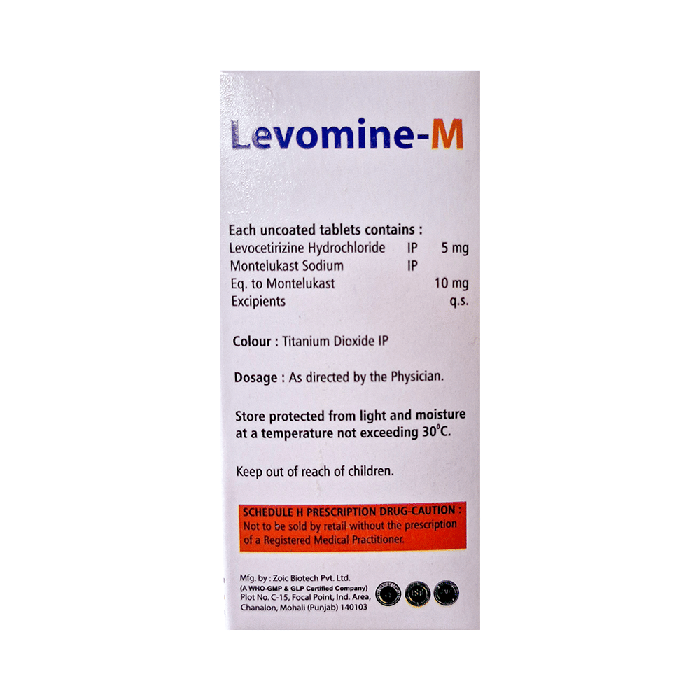 Levomine-M Tablet is a combination medicine used in the treatment of allergic symptoms such as runny nose, stuffy nose, sneezing, itching, swelling, watery eyes and congestion or stuffiness. It also reduces inflammation in the airways and make breathing easier. Levomine-M Tablet is taken with or without food in a dose and duration as advised by the doctor. The dose you are given will depend on your condition and how you respond to the medicine. You should keep taking this medicine for as long as your doctor recommends. If you stop treatment too early your symptoms may come back and your condition may worsen. Let your healthcare team know about all other medications you are taking as some may affect, or be affected by this medicine.The most common side effects are nausea, diarrhea, vomiting, dryness in the mouth, headache, skin rash, flu-like symptoms, and fatigue. Most of these are temporary and usually resolve with time. Contact your doctor straight away if you are at all concerned about any of these side effects. This medicine may cause dizziness and sleepiness, so do not drive or do anything that requires mental focus until you know how this medicine affects you. Avoid drinking alcohol while taking this medicine as it can worsen your sleepiness.Never support self-medication or recommend your medicine to another person. It is beneficial to have plenty of fluids while taking this medication. Before you start taking this medicine it is important to inform your doctor if you are suffering from kidney disease.