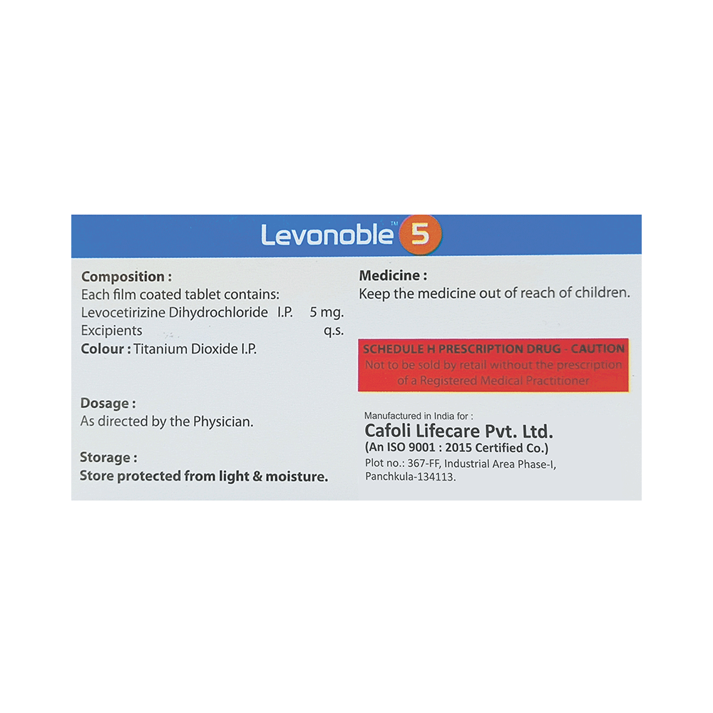 Levonoble 5 Tablet belongs to a group of medicines called antihistamines. It is used to treat various allergic conditions such as hay fever, conjunctivitis, some skin reactions such as eczema, hives, and reactions to bites and stings. It also relieves watery eyes, runny nose, sneezing, and itching. Levonoble 5 Tablet can be taken with or without food. The dose required by you may vary depending on what you are taking it for. This medicine is usually taken in the evening, but follow the advice of your doctor on how to take it. You may need this medicine only on days you have symptoms, but if you are taking it to prevent the symptoms then you should take it regularly. If you miss doses or stop taking it earlier than advised, your symptoms may come back.Common side effects include somnolence (sleepiness), dry mouth, fatigue, fever, cough, nasopharyngitis, and nosebleed. These are usually mild and go away after a couple of days as your body adjusts to it. Consult your doctor if any of the side effects persist or worry you.Before taking it, tell your doctor if you have any kidney problems or epilepsy (seizures). Your dose may need to be modified or this medicine may not suit you. Some other medicines can interact with this medicine so let your healthcare team know what else you are taking. You should also talk to your doctor before using this medicine if you are pregnant or breastfeeding, although it is not thought to be harmful.