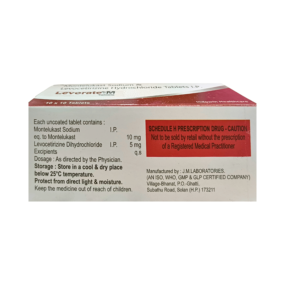 In Treatment of Allergic skin conditionsLevorate-M Tablet is effective in treating allergic skin conditions with inflammation and itching. It reduces the actions of chemicals in the body that cause inflammation of the skin. When used correctly it is a safe and effective treatment. It reduces the redness, rash, pain or itchiness caused by your skin’s reaction to an irritant. It thus improves your self-esteem and confidence as your appearance changes. Keep taking it for as long as it is prescribed to get the full benefits.In Treatment of Sneezing and runny nose due to allergiesLevorate-M Tablet is a combination medicine that provides relief from symptoms such as blocked or runny nose, sneezing and itchy or watery eyes. This will make it easier for you to go about your daily activities. It rarely has any serious side effects and you may only need to take it on days you have symptoms. If you are taking it to prevent getting symptoms you should use it regularly to get the most benefit.In Treatment of Hay feverHay fever, also called allergic rhinitis, causes cold-like signs and symptoms, such as a runny nose, itchy eyes, congestion, sneezing and sinus pressure. The only difference is that in hay fever, these symptoms are not produced due to a virus but are simply allergic responses of our body to allergens (allergy causing agents such as pollen). Levorate-M Tablet is used to provide relief from these symptoms of hay fever. It works by blocking the release of the chemical substance responsible for producing such allergy symptoms. Levorate-M Tablet is a safe medicine which helps treat hay fever and makes us feel at ease.show moreshow less