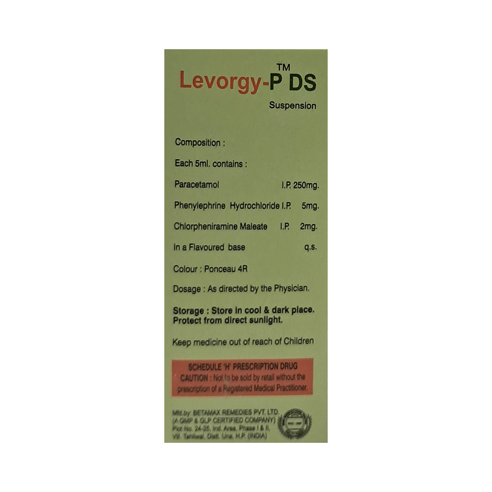 Levorgy-P DS Oral Suspension is a medicine used in the treatment of common cold symptoms. It provides relief from symptoms such as headache, sore throat, runny nose, muscular pain, and fever. Levorgy-P DS Oral Suspension can be taken with or without food. The dose and duration will depend on the severity of your condition. You should keep taking the medicine even if you feel better until the doctor says it is alright to stop using it.Using this medicine may cause a few common side effects such as nausea, vomiting, sleepiness, dizziness, and headache. If any of these side effects do not resolve with time or get worse, you should let your doctor know. Your doctor may be able to suggest ways of preventing or reducing the side effects. In general, you should try to use the smallest amount necessary to control your symptoms.Before using the medicine, you should tell your doctor if you have any other medical conditions or disorders. To make sure it is safe, you should let your doctor know all the other medicines you are taking. Also, tell your doctor if you have any problems with the liver or kidneys. Avoid consumption of alcohol while on treatment with this medicine as it may increase the chance of some side effects. Pregnant and breastfeeding women should consult their doctors first before using the medicine.