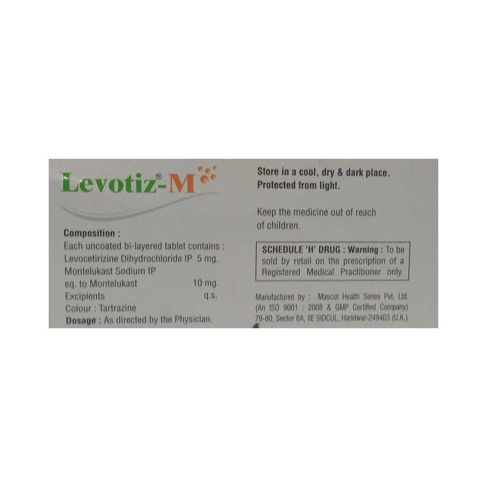 Levotiz-M Tablet is a combination medicine used in the treatment of allergic symptoms such as runny nose, stuffy nose, sneezing, itching, swelling, watery eyes and congestion or stuffiness. It also reduces inflammation in the airways and make breathing easier. Levotiz-M Tablet is taken with or without food in a dose and duration as advised by the doctor. The dose you are given will depend on your condition and how you respond to the medicine. You should keep taking this medicine for as long as your doctor recommends. If you stop treatment too early your symptoms may come back and your condition may worsen. Let your healthcare team know about all other medications you are taking as some may affect, or be affected by this medicine.The most common side effects are nausea, diarrhea, vomiting, dryness in the mouth, headache, skin rash, flu-like symptoms, and fatigue. Most of these are temporary and usually resolve with time. Contact your doctor straight away if you are at all concerned about any of these side effects. This medicine may cause dizziness and sleepiness, so do not drive or do anything that requires mental focus until you know how this medicine affects you. Avoid drinking alcohol while taking this medicine as it can worsen your sleepiness.Never support self-medication or recommend your medicine to another person. It is beneficial to have plenty of fluids while taking this medication. Before you start taking this medicine it is important to inform your doctor if you are suffering from kidney disease.