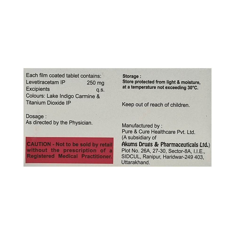 Levtock 250mg Tablet is an anti-epileptic medicine used to treat seizures (fits) in epilepsy. It can be used alone or along with other medicines. It helps to prevent seizures for as long as you continue to take it. Levtock 250mg Tablet suppresses the abnormal electrical activity in the brain. You can take it with or without food but try to take it at the same time each day to get the most benefit. The dose will depend on your condition and how you respond to the medicine. Your doctor will advise the right dose for you. It is generally advised as a long-term treatment. You should continue taking it for as long as your doctor has told you to, even if you feel well. If you stop or miss doses your seizures could get worse.Some common side effects of this medicine include headache, irritation, sleepiness, behavior changes, aggressive behavior, and decreased appetite. Side effects are more common during the first few weeks and usually lessen as your body gets used to the medicine. Most of these side effects do not need medical attention, but some of them can be serious. A small number of people being treated with this medicine have had thoughts of harming or killing themselves. Contact your doctor if your mood changes for the worse.Before taking it, you should tell your doctor if you have kidney problems, depression, or suicidal thoughts and if you are pregnant, planning to become pregnant, or breastfeeding. Your doctor may suggest regular blood tests to monitor your kidney function while taking this medicine.