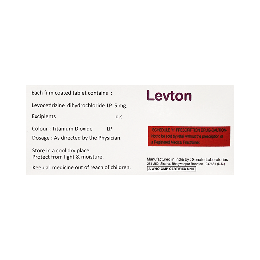 Levton Tablet is an antihistaminic medication. It treats allergy symptoms such as itching, swelling, and rashes by blocking the effects of a chemical messenger (histamine) in the body.