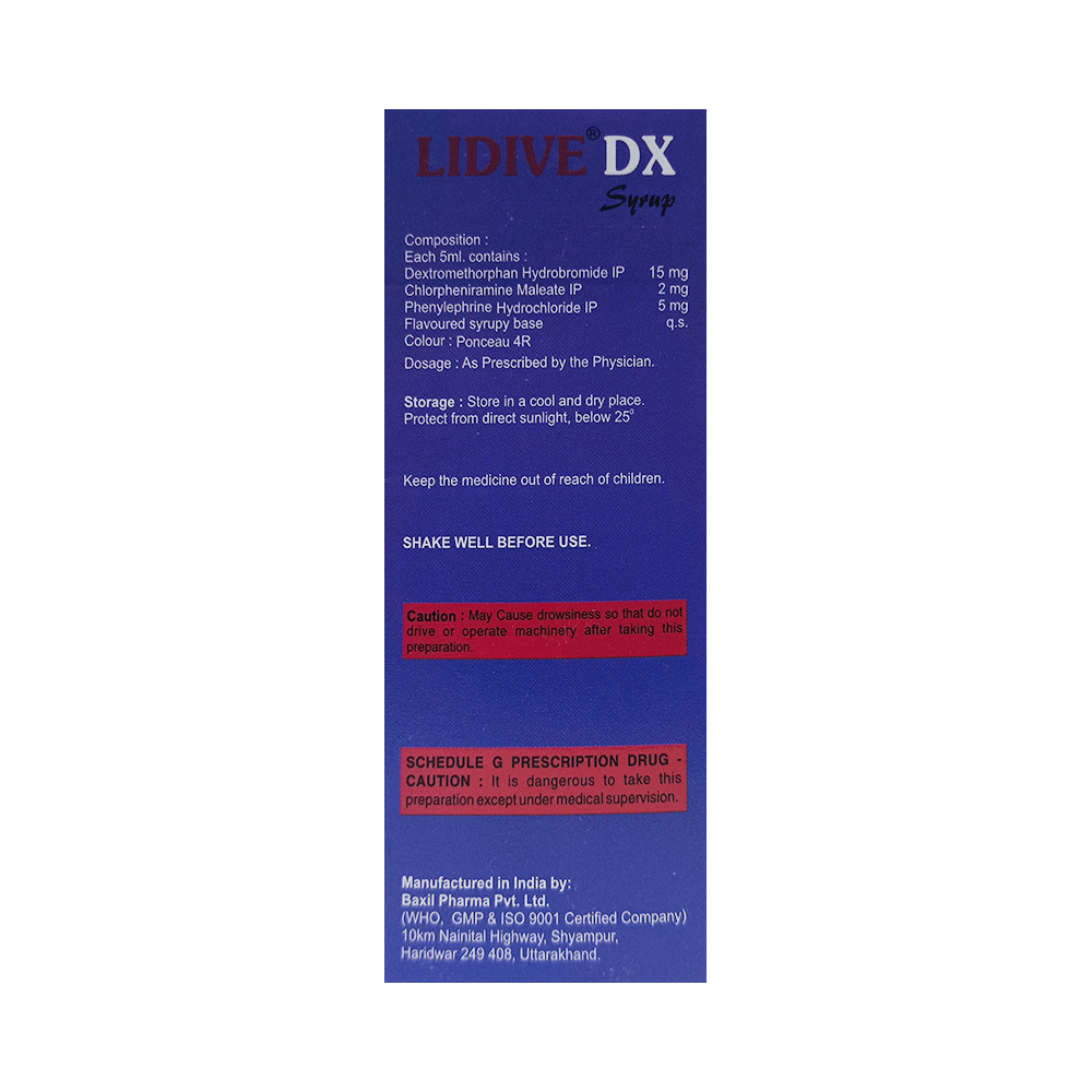 Lidive DX Syrup Mango Alcohol & Sugar Free is a medicine used in the treatment of common cold and cough. It can provide quick relief from cough and common cold symptoms like runny nose, stuffy nose, sneezing, watery eyes, and congestion or stuffiness. Lidive DX Syrup Mango Alcohol & Sugar Free is taken with or without food in a dose and duration as advised by the doctor. The dose you are given will depend on your condition and how you respond to the medicine. You should keep taking this medicine for as long as your doctor recommends. If you stop treatment too early your symptoms may come back and your condition may worsen. Let your healthcare team know about all other medications you are taking as some may affect, or be affected by this medicine.Common side effects of this medicine include headache, sedation, double vision, vomiting, diarrhea, dry mouth, and nausea. Most of these are temporary and usually resolve with time. Contact your doctor straight away if you are at all concerned about any of these side effects. This medicine can also cause sleepiness, so do not drive or do anything that requires mental focus until you know how this medicine affects you. Avoid drinking alcohol while taking this medicine as it can worsen your sleepiness.Never support self-medication or recommend your medicine to another person. It is beneficial to have plenty of fluids while taking this medication. Before taking this medicine, you should tell your doctor if you are pregnant, planning pregnancy or breastfeeding. You should also tell your doctor if you have any kidney or liver diseases so that your doctor can prescribe a suitable dose for you.