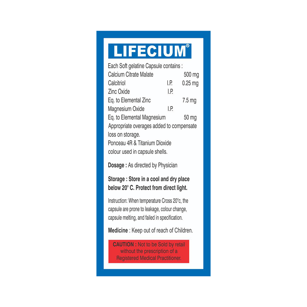 Lifecium Softgel Capsule is a combination of four medicines: Calcitriol, Zinc Oxide, Magnesium Oxide and Calcium which treat osteoporosis. These medicines help build and maintain bones and additionally support the muscles needed to avoid falls.