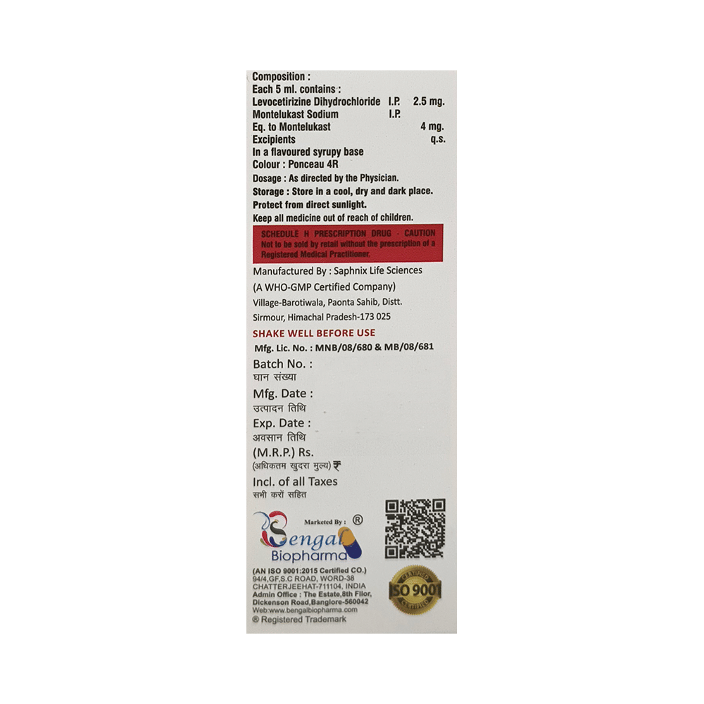 Salt Composition: Levocetirizine (2.5mg/5ml) + Montelukast (4mg/5ml)