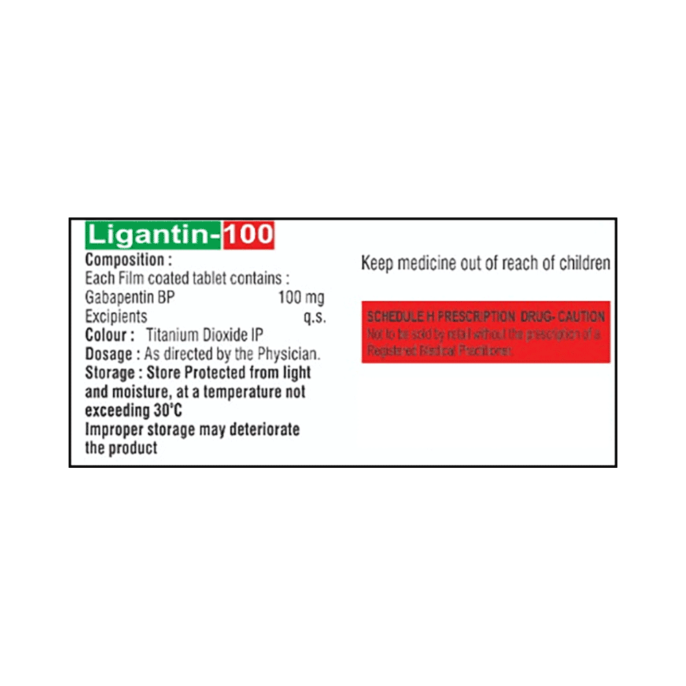 Ligantin 100 Tablet is a medicine used to relieve the pain caused by nerve damage (neuropathic pain) due to various conditions like diabetes, shingles (herpes zoster infection), spinal cord injury, etc. It is also used to treat certain types of seizures (fits) in combination with other medicines. Ligantin 100 Tablet belongs to the anti-epileptic group of medicines. You may take it with or without food, but it is important to take this medicine at the same time each day to get the most benefit. The exact dose and duration of treatment will depend on your condition and how you respond to it. Your doctor will probably start this medicine at a low dose and increase it gradually. It may take a few weeks for the medicine to work properly. Follow your doctor’s instructions and continue taking it regularly until your doctor advises you to stop. Do not miss any dose, otherwise, your condition may worsen.Most people taking Ligantin 100 Tablet do not experience any side effects. The most common ones are feeling sleepy, dizzy, or tired (fatigue). These are usually mild and go away by themselves as your body gets used to the medicine. Most side effects are not serious and do not need medical attention. Talk to your doctor if any of the side effects persist or worry you.You should avoid drinking alcohol along with this medicine as it may lead to excessive sleepiness and dizziness. Let your doctor know right away if you develop any unusual mood changes like anxiety, agitation, depression, or thoughts about harming yourself.Before taking Ligantin 100 Tablet, you should tell your doctor if you have any kidney-related problems or if you are more than 65 years old. Your doctor may prescribe a different dose in such people. Women who are pregnant, breastfeeding, or planning to become pregnant should also consult their doctor before using this medicine.