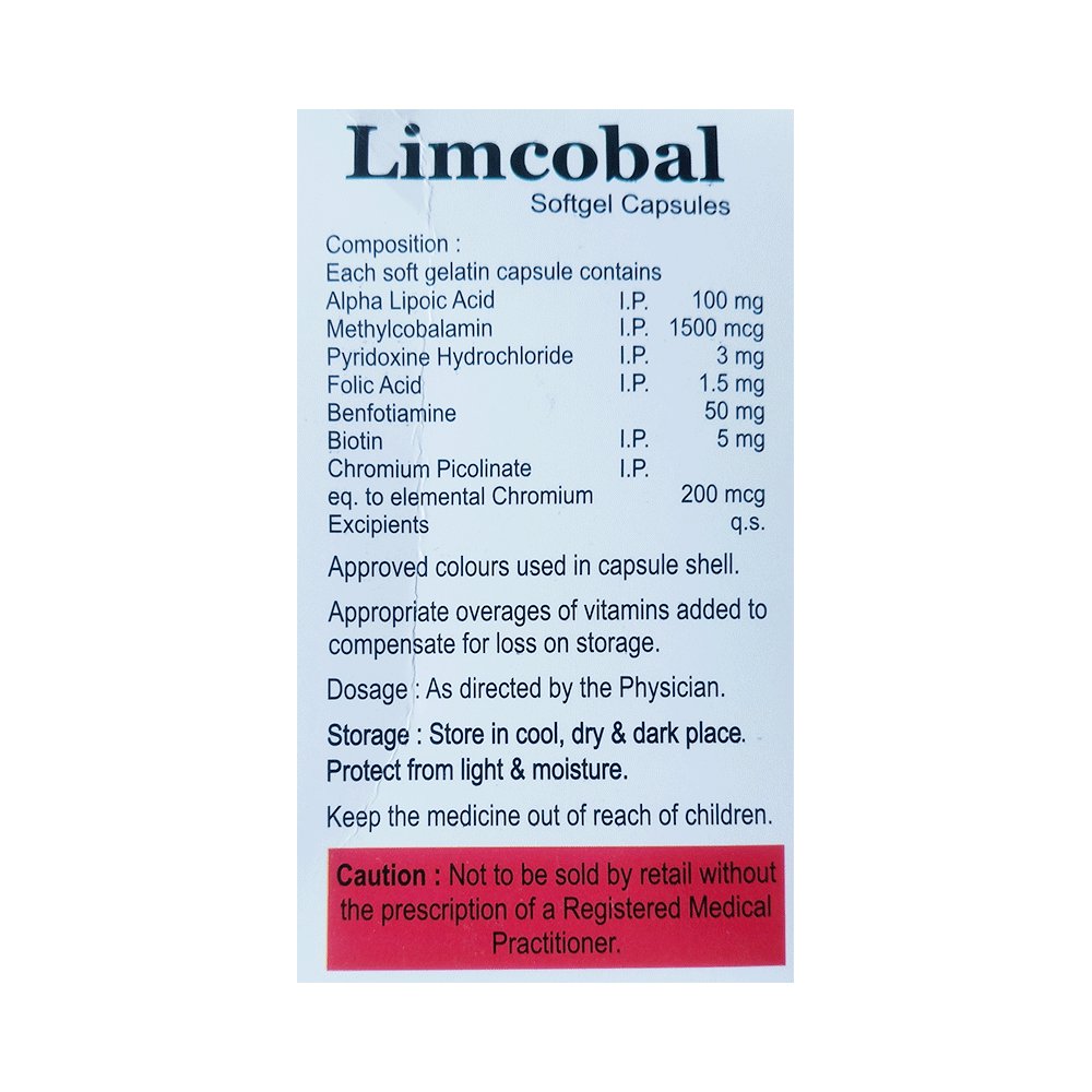 Limcobal Softgel Capsule is a combination of seven medicines : Methylcobalamin, Alpha Lipoic Acid, Vitamin B6 (Pyridoxine), Folic Acid, Benfotiamine, Biotin, and Chromium Picolinate. Methylcobalamin is a form of vitamin B12 that restores its level in the body thereby helping in treating certain anemias and nerve problems. Alpha lipoic acid acts as a potent antioxidant (substance that protects against cell damage) by neutralizing the free radicals (waste products formed in the body during energy production) such as reactive oxygen and nitrogen species. Further, it initiates natural antioxidant processes in the body. It also maintains the levels of Vitamin E and Vitamin C in the body. Vitamin B6 (Pyridoxine) is a nutritional supplement that possesses anti-nausea properties and helps in proper functioning of nerves. Folic Acid is a form of vitamin B. It plays a vital role in the formation of red blood cells, which carry oxygen throughout the body. It is also essential in pregnancy due to its role in the development of the unborn baby's brain and spinal cord. Chromium Picolinate and Benfotiamine are nutritional supplements that provide essential nutrients to our body and improve overall health.