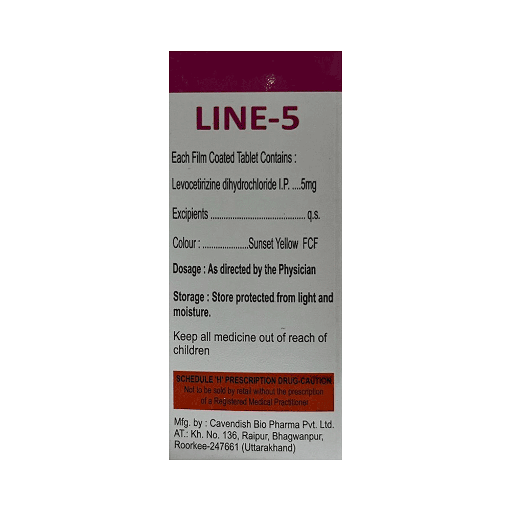Line 5 Tablet belongs to a group of medicines called antihistamines. It is used to treat various allergic conditions such as hay fever, conjunctivitis, some skin reactions such as eczema, hives, and reactions to bites and stings. It also relieves watery eyes, runny nose, sneezing, and itching. Line 5 Tablet can be taken with or without food. The dose required by you may vary depending on what you are taking it for. This medicine is usually taken in the evening, but follow the advice of your doctor on how to take it. You may need this medicine only on days you have symptoms, but if you are taking it to prevent the symptoms then you should take it regularly. If you miss doses or stop taking it earlier than advised, your symptoms may come back.Common side effects include somnolence (sleepiness), dry mouth, fatigue, fever, cough, nasopharyngitis, and nosebleed. These are usually mild and go away after a couple of days as your body adjusts to it. Consult your doctor if any of the side effects persist or worry you.Before taking it, tell your doctor if you have any kidney problems or epilepsy (seizures). Your dose may need to be modified or this medicine may not suit you. Some other medicines can interact with this medicine so let your healthcare team know what else you are taking. You should also talk to your doctor before using this medicine if you are pregnant or breastfeeding, although it is not thought to be harmful.