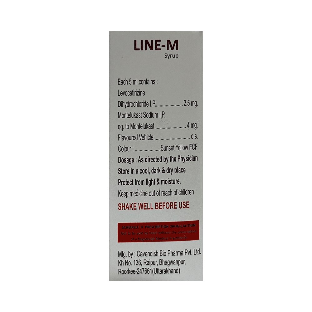 Line-M Syrup is commonly prescribed in children to treat symptoms of allergy such as runny nose, sneezing, itching, swelling, congestion, and watery eyes. It may also help in the treatment of asthma and skin allergies. Give this medicine to your child at a fixed time before or after food in the prescribed dose, time, and way. For asthma, prefer giving Line-M Syrup in the evening or 2 hours before physical activity. For allergy, it is best to give it either in the morning or in the evening, depending upon the time of onset of symptoms. In case your child has both, prefer giving it in the evening. If your child vomits within 30 minutes of taking this medicine, give the same dose again, but skip it if it’s already time for the next dose.Your child may start to feel better after a few regular doses. However, you must still complete the prescribed dose to ensure maximum benefit. Moreover, stopping the medicine abruptly may worsen your child’s condition. This medicine may cause some minor and temporary side effects like vomiting, diarrhea, nausea, dizziness, dry mouth, rash, and headache. Usually, these episodes subside once your child’s body adapts to the medicine. However, in case these effects persist or start bothering your child, consult your child’s doctor without any delay.Let your child’s doctor know if your child is already taking any medicines. Also, narrate your child’s complete medical history, including any prior episodes of allergy, heart problem, blood disorder, vascular disorders, birth defects, airway obstruction, lung anomaly, skin disorder, liver impairment, and kidney malfunction. This information is critical for dose alterations and in planning your child’s overall treatment.