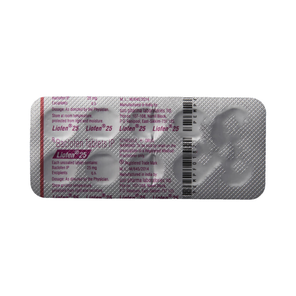 Liofen 25 Tablet is a muscle relaxer. It is used to treat muscular symptoms such as rigidity, tension, and stiffness that may occur due to various conditions such as cerebral palsy, multiple sclerosis, motor neuron disease, or injury to the head, brain, or spine. Liofen 25 Tablet can be taken with food. In general, you should try to use the smallest amount necessary to control your symptoms, for the shortest possible time. You should take this medicine regularly while you need it. Try not to miss doses as this will make the medicine less effective.Some common side effects of this medicine include fatigue, weakness, drowsiness, and dizziness. If any of these side effects do not go away or get worse, you should let your doctor know. Your doctor may be able to suggest ways of preventing or reducing the symptoms.To make sure it is safe for you, before taking this medicine, let your doctor know if you have any medical conditions or disorders. You should also tell your doctor all the other medicines you are using or taking. Pregnant and breastfeeding women should consult their doctors before using this medicine.