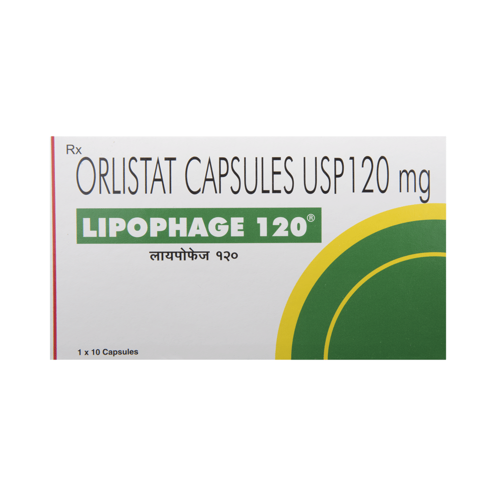 Lipophage 120 Capsule is a medicine used in the treatment of obesity. It helps the body in blocking the absorption of fats from the small intestines and stomach. This way it can help reduce calorie intake and weight loss over time. Lipophage 120 Capsule is geenrally taken orally 3 times daily, during (or up to 1 hour after) each main meal containing fat. It can also be taken up to 2 hours after midmeal. It works best when it is used along with regular physical activity and a healthy diet. It should not be taken for a long term unless your doctor tells you to do so. For better efficacy of the medicine, fat-rich foods should be avoided along with the medicine.Some of the common side effects of Lipophage 120 Capsule include the presence of fat in the stool, abdominal pain, and diarrhea. If any of the side effects bother you, tell your doctor without delay. They may be able to help you by adjusting your dose or prescribe you an alternate medicine.Pregnant and breastfeeding women must take this medicine only with a valid prescription. Inform your doctor before taking the medicine if you have any other medical conditions or are taking any other medications. This medicine should not be considered as a long-term treatment unless you are prescribed by your doctor.