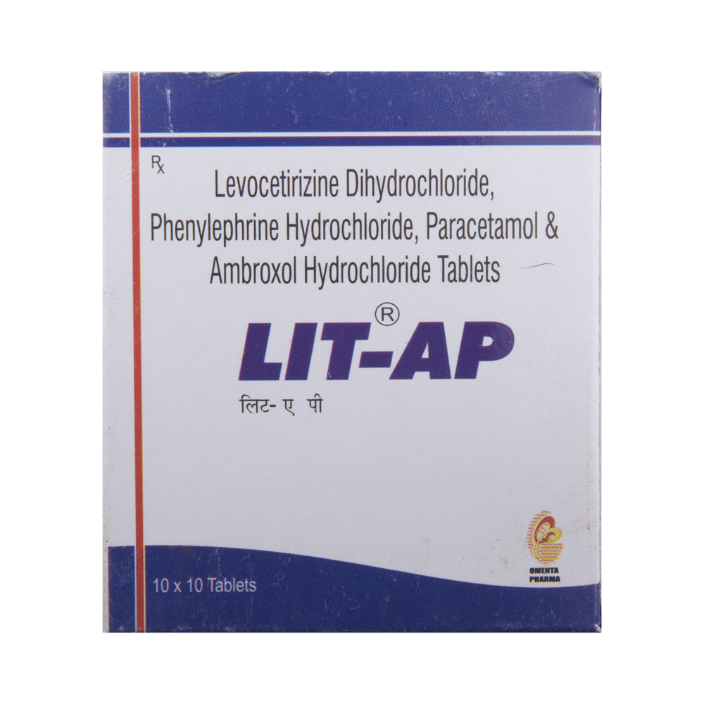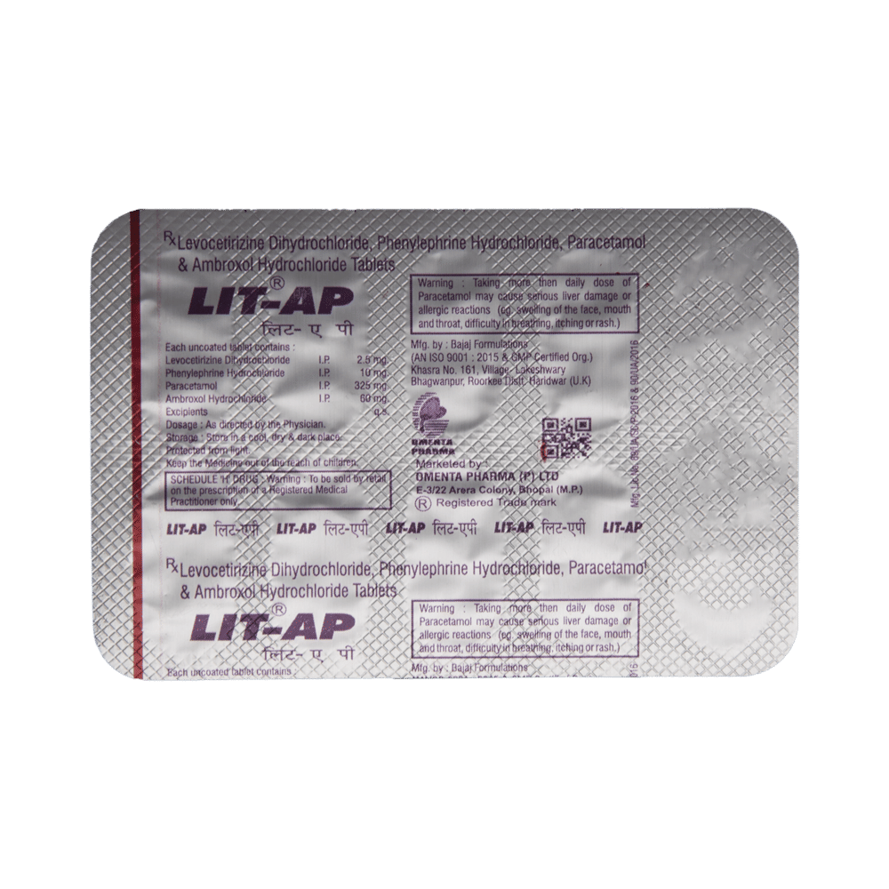 Lit AP Tablet is a combination medicine used to treat common cold symptoms. It thins mucus in the nose, windpipe, and lungs making it easier to cough out. It also provides relief from seasonal allergic conditions such as runny nose, watery eyes, sneezing, and congestion or stuffiness. Lit AP Tablet is taken with or without food in a dose and duration as advised by the doctor. The dose you are given will depend on your condition and how you respond to the medicine. You should keep taking this medicine for as long as your doctor recommends. If you stop treatment too early your symptoms may come back and your condition may worsen. Let your doctor know about all other medications you are taking as some may affect, or be affected by this medicine.The most common side effects are nausea, vomiting, dryness in mouth, stomach upset, headache, fatigue, loss of appetite, and insomnia. Most of these are temporary and usually resolve with time. Contact your doctor straight away if you are at all concerned about any of these side effects. It can also cause dizziness and sleepiness, so do not drive or do anything that requires mental focus until you know how this medicine affects you. Avoid drinking alcohol while taking this medicine as it can make dizziness worse.Before taking it, you should tell your doctor if you have any liver diseases so that your doctor can prescribe a suitable dose for you. Also tell your doctor if you are pregnant, planning pregnancy or breastfeeding.