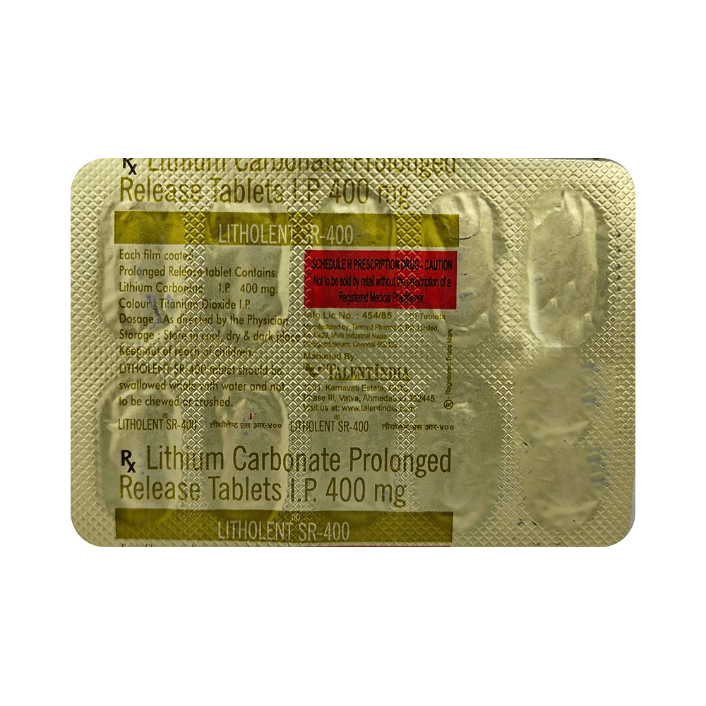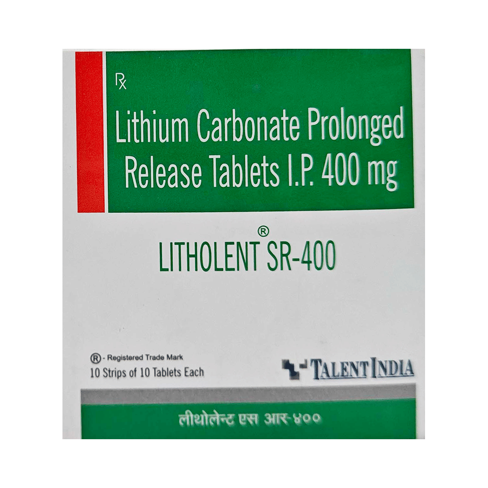 Litholent SR 400 Tablet is used in the treatment of bipolar disorder and mania in adults. It is sometimes used to treat other behavioral disorders as well. It reduces the frequency of manic episodes and decreases the intensity of those episodes that might occur. Litholent SR 400 Tablet should be taken with food. However, it is advised to take it at the same time each day as this helps to maintain a consistent level of medicine in the body. Do not skip any doses and finish the full course of treatment even if you feel better. If you have missed a dose, take it as soon as you remember it. You should continue to take this medicine for as long as the doctor advises and do not stop taking it suddenly as it may result in harmful effects.Side effects associated with the use of this medicine include tremors, slurred speech, uncoordinated body movements, nausea, Vomiting, acne, increased white blood cell count, and memory impairment. It may also cause hair loss, enlarged thyroid gland, skin rash, and increased thirst. This medicine may also cause weight gain and to control it, you should have a balanced diet and exercise regularly. If you have been taking this medicine for a long time then regular monitoring of thyroid and kidney function may be required.