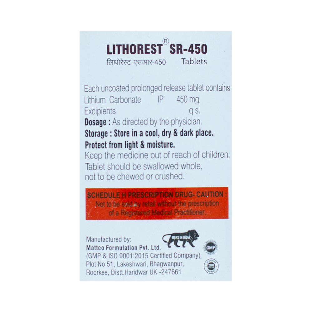 Lithorest SR 450 Tablet is used in the treatment of bipolar disorder and mania in adults. It is sometimes used to treat other behavioral disorders as well. It reduces the frequency of manic episodes and decreases the intensity of those episodes that might occur. Lithorest SR 450 Tablet should be taken with food. However, it is advised to take it at the same time each day as this helps to maintain a consistent level of medicine in the body. Do not skip any doses and finish the full course of treatment even if you feel better. If you have missed a dose, take it as soon as you remember it. You should continue to take this medicine for as long as the doctor advises and do not stop taking it suddenly as it may result in harmful effects.Side effects associated with the use of this medicine include tremors, slurred speech, uncoordinated body movements, nausea, Vomiting, acne, increased white blood cell count, and memory impairment. It may also cause hair loss, enlarged thyroid gland, skin rash, and increased thirst. This medicine may also cause weight gain and to control it, you should have a balanced diet and exercise regularly. If you have been taking this medicine for a long time then regular monitoring of thyroid and kidney function may be required.
