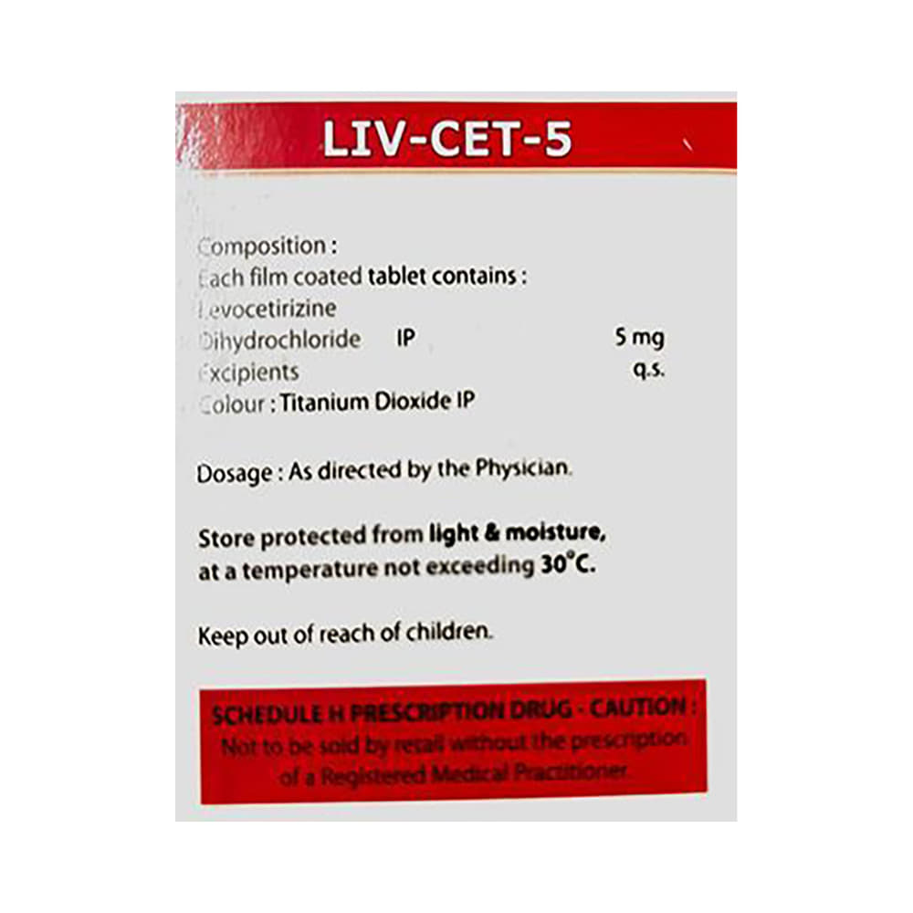 Livcet 5mg Tablet belongs to a group of medicines called antihistamines. It is used to treat various allergic conditions such as hay fever, conjunctivitis, some skin reactions such as eczema, hives, and reactions to bites and stings. It also relieves watery eyes, runny nose, sneezing, and itching. Livcet 5mg Tablet can be taken with or without food. The dose required by you may vary depending on what you are taking it for. This medicine is usually taken in the evening, but follow the advice of your doctor on how to take it. You may need this medicine only on days you have symptoms, but if you are taking it to prevent the symptoms then you should take it regularly. If you miss doses or stop taking it earlier than advised, your symptoms may come back.Common side effects include somnolence (sleepiness), dry mouth, fatigue, fever, cough, nasopharyngitis, and nosebleed. These are usually mild and go away after a couple of days as your body adjusts to it. Consult your doctor if any of the side effects persist or worry you.Before taking it, tell your doctor if you have any kidney problems or epilepsy (seizures). Your dose may need to be modified or this medicine may not suit you. Some other medicines can interact with this medicine so let your healthcare team know what else you are taking. You should also talk to your doctor before using this medicine if you are pregnant or breastfeeding, although it is not thought to be harmful.