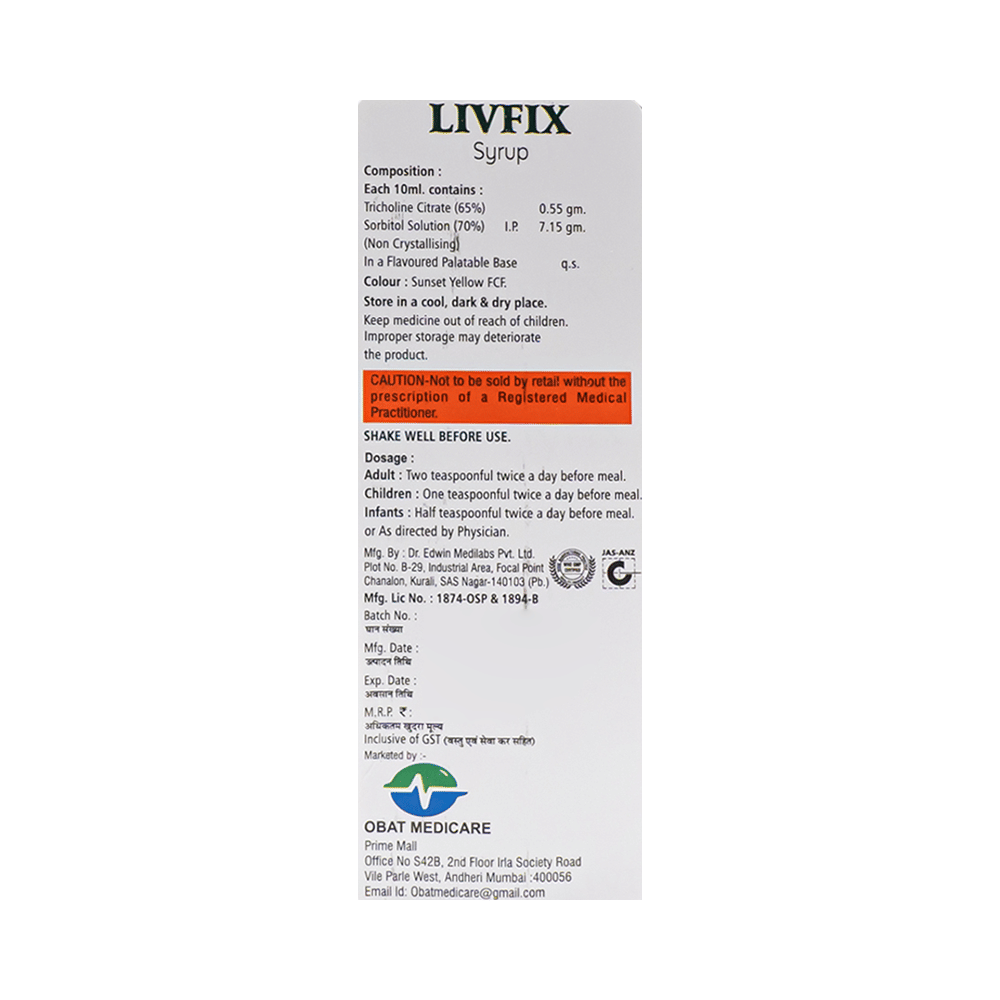 Livfix Syrup is a combination medicine used in the treatment of fatty liver disease. It is the prescription medicine works by improving the functioning of the liver. Livfix Syrup is taken with or without food in a dose and duration as advised by the doctor. The dose you are given will depend on your condition and how you respond to the medicine. You should keep taking this medicine for as long as your doctor recommends. If you stop treatment too early your symptoms may come back and your condition may worsen. Let your healthcare team know about all other medications you are taking as some may affect, or be affected by this medicine.Common side effects include dryness in the mouth, stomach pain, nausea, and diarrhea. These are generally temporary and usually resolve with time. Contact your doctor straight away if you are at all concerned about these side effects. To prevent and manage dry mouth stay hydrated and maintain good oral hygiene. This medicine can also cause drowsiness, so do not drive or do anything that requires mental focus until you know how this medicine affects you. Avoid drinking alcohol while taking this medicine as it can worsen your drowsiness.Before taking this medicine, you should tell your doctor if you are pregnant, planning pregnancy or breastfeeding. You should tell your doctor if you have any kidney or liver diseases so that your doctor can prescribe a suitable dose for you.