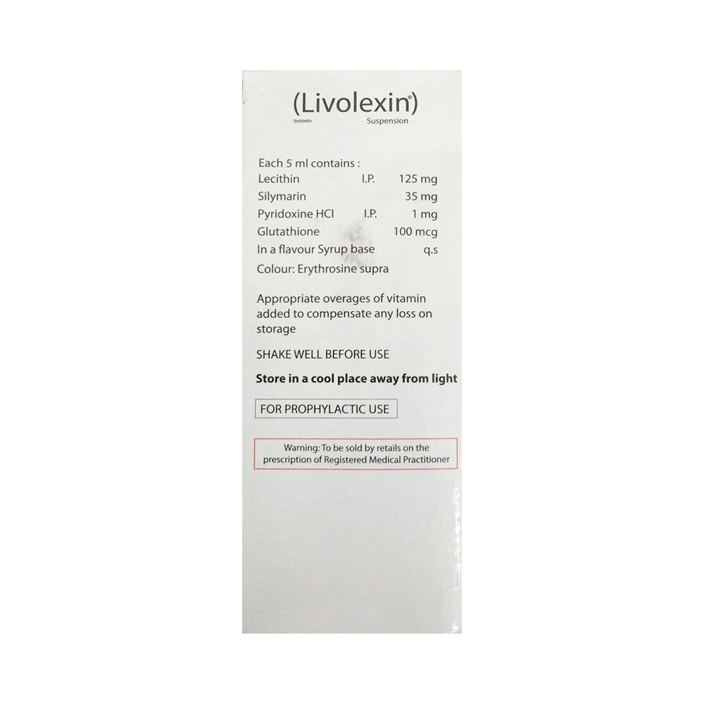 Livolexin Suspension is a combination of four medicines : Lecithin, Silymarin, Vitamin B6 (Pyridoxine), and Glutathione. Lecithin is a naturally occurring fat that helps improve liver function and helps reduce cholesterol. Silymarin and Glutathione are antioxidants. Silymarin is obtained from milk thistle seeds (Silybum marianum). It has antioxidant and anti-inflammatory properties that protect liver cells from harmful effects of toxic chemicals (called free radicals) as well as some other medicines. Vitamin B6 (Pyridoxine) is a form of vitamin B that provides nutritional benefits.