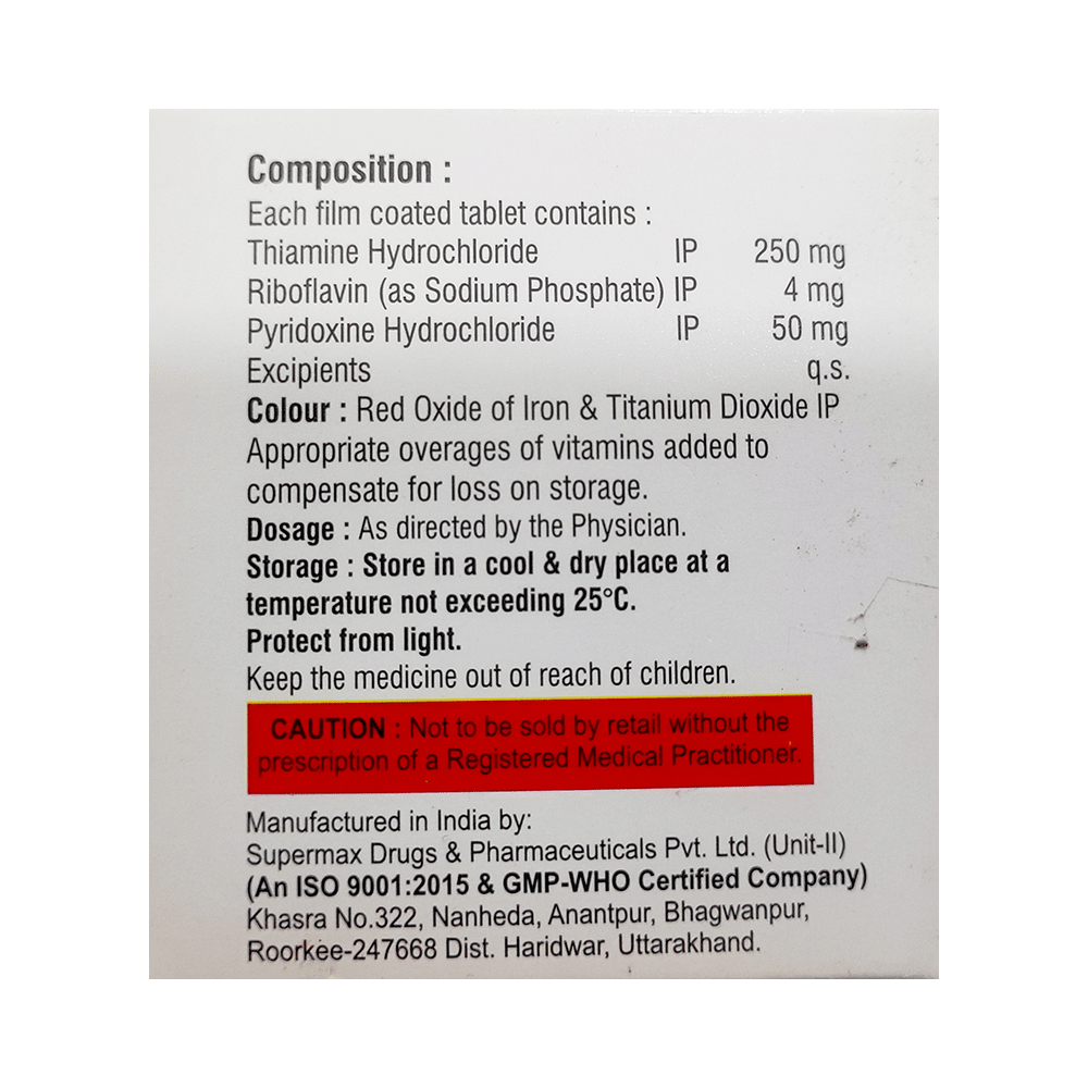 Salt Composition: Thiamine(Vitamin B1) (250mg) + Vitamin B2 (4mg) + Vitamin B6 (Pyridoxine) (50mg)