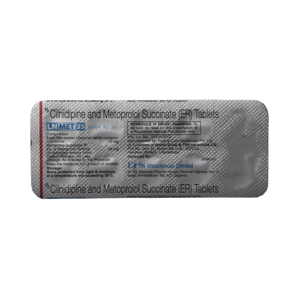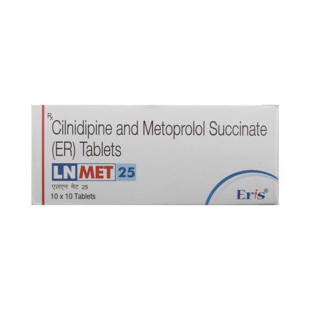 LN Met 25 Tablet ER is a medicine used to treat hypertension (high blood pressure). It is a combination of two medicines that effectively controls blood pressure when a single medication is not effective. By lowering the blood pressure, it helps in preventing future heart attack and stroke. You can take LN Met 25 Tablet ER at any time of day, with food, but it is best to take it at the same time each day. Keep taking it for as long as advised by your doctor. Even if you feel well, do not stop this medicine on your own because high blood pressure often has no symptoms. If you stop taking it, your condition may get worse. Keeping active with regular exercise, reducing your weight and eating a healthy diet will also help control your blood pressure. Follow your doctor’s advice while taking this medicine.It may cause side effects like headache, ankle swelling, slow heart rate, and nausea. It may also cause dizziness, so do not drive or do anything that requires mental focus until you know how this medicine affects you. To reduce the swelling, raise your legs while sitting down. You may be asked for regular monitoring of blood pressure, kidney function, blood sugar level, and electrolytes level while on the treatment.Before taking it, let your doctor know if you have any liver or kidney problems. Pregnant or breastfeeding women should also consult their doctor for advice before taking this medicine. You also need to tell your doctor what other medicines you are taking especially those used to treat high blood pressure or heart conditions.