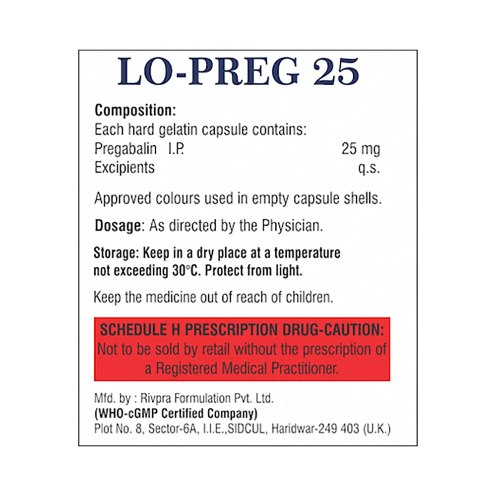 LO-Preg 25 Capsule is a medicine used to relieve pain caused by nerve damage (neuropathic pain) due to diabetes, shingles (herpes zoster infection), spinal cord injury, or other conditions. It is also used to treat widespread muscle pain and stiffness in people with fibromyalgia. LO-Preg 25 Capsule belongs to the anti-epileptic group of medicines and can also be used to treat certain types of seizures (fits) in combination with other medicines. Additionally, it may also be prescribed to treat the symptoms of anxiety disorder if other medicines are not suitable.You can take LO-Preg 25 Capsule with or without food, but it is important to take this medicine at the same time each day to get the most benefit. The exact dose and duration of treatment will depend on your condition and how you respond to it. Your doctor will probably start this medicine at a low dose and increase it gradually. It may take a few weeks for the medicine to work properly. Follow your doctor’s instructions and continue taking it regularly until your doctor advises you to stop. Do not miss any dose, otherwise, your condition may worsen.The side effects of this medicine are usually mild and go away by themselves. The most common ones are feeling sleepy or dizzy, dryness in the mouth, blurred vision, weight gain, edema (swelling over the whole body), and difficulty in concentrating. Most side effects are not serious and do not need medical attention. Talk to your doctor about potential side effects and ways in which you might prevent or cope with them.Before taking the medicine you should tell your doctor if you are pregnant, breastfeeding, or planning to become pregnant. Be careful while driving as sleepiness, dizziness, and blurring of vision may be seen as side effects. You should avoid drinking alcohol along with this medicine as it may lead to excessive sleepiness and dizziness.