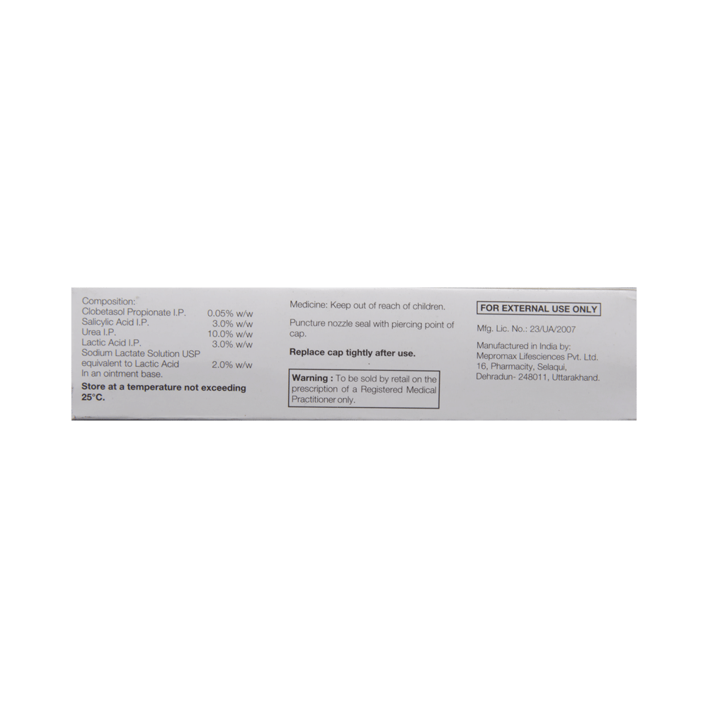 Salt Composition: Clobetasol (0.05% w/w) + Salicylic Acid (3% w/w) + Lactic Acid (3% w/w) + Urea (10% w/w)