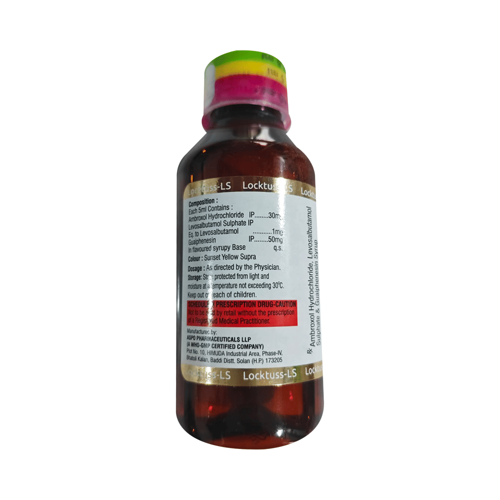 Locktuss-LS Syrup is a combination medicine used in the treatment of cough with mucus. It thins mucus in the nose, windpipe, and lungs, making it easier to cough out. It also provides relief from runny nose, sneezing, itching, and watery eyes. Locktuss-LS Syrup is taken with or without food in a dose and duration as advised by the doctor. The dose you are given will depend on your condition and how you respond to the medicine. You should keep taking this medicine for as long as your doctor recommends. If you stop treatment too early your symptoms may come back and your condition may worsen. Let your healthcare team know about all other medications you are taking as some may affect, or be affected by this medicine.The most common side effects are nausea, diarrhea, stomach pain, vomiting, muscle cramp, headache, skin rash, and increased heart rate. Most of these are temporary and usually resolve with time. Contact your doctor straight away if you are at all concerned about any of these side effects. This medicine can also cause sleepiness, so do not drive or do anything that requires mental focus until you know how this medicine affects you. Avoid drinking alcohol while taking this medicine as it can make sleepiness worse.Never support self-medication or recommend your medicine to another person. It is beneficial to have plenty of fluids while taking this medication. Before taking this medicine, you should tell your doctor if you are pregnant, planning pregnancy, or breastfeeding. You should also tell your doctor if you have any kidney or liver diseases so that your doctor can prescribe a suitable dose for you.