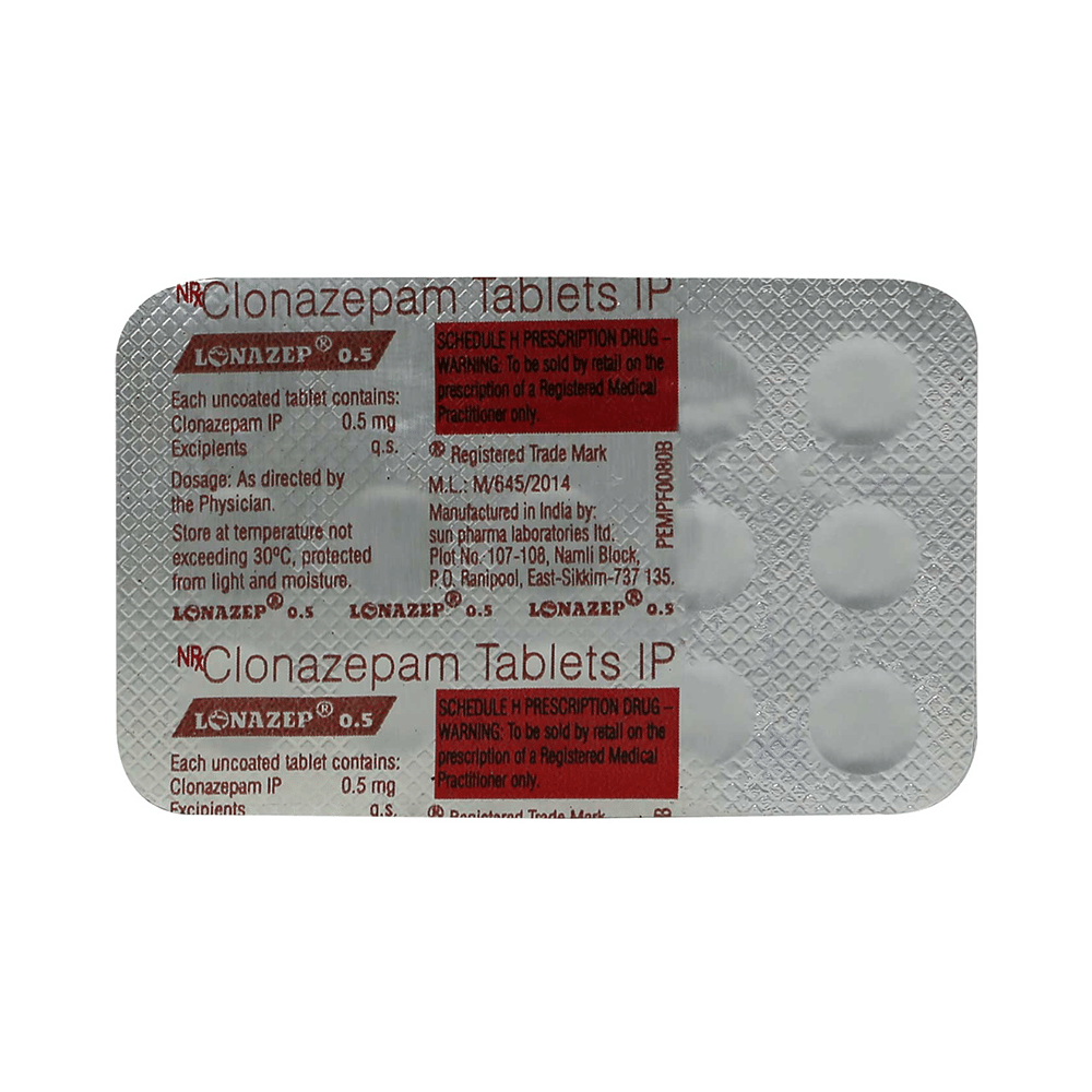Lonazep 0.5mg Tablet is a prescription medicine used to treat epilepsy (seizures) and anxiety disorder. It helps to decrease the abnormal and excessive activity of the nerve cells and calms the brain. Lonazep 0.5mg Tablet may be taken with or without food. However, take it at the same time each day as this helps to maintain a consistent level of medicine in the body. Take this medicine in the dose and duration as advised by your doctor as it has a high potential of habit-forming. If you have missed a dose, take it as soon as you remember it and finish the full course of treatment even if you feel better. You should not stop this medicine suddenly without talking to your doctor as it may increase the seizure frequency and can cause nausea, anxiety, flu-like symptoms, and muscle pain.Some common side effects of this medicine include fatigue, depression and impaired coordination. It may also cause dizziness and sleepiness, so do not drive or do anything that requires mental focus until you know how this medicine affects you. It is important to inform your doctor if you develop any unusual changes in mood or depression as this medicine may cause suicidal thoughts.