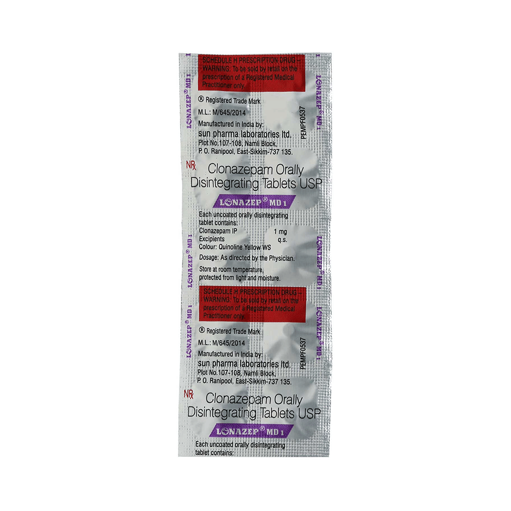 Lonazep 1mg Tablet MD is a prescription medicine used to treat epilepsy (seizures) and anxiety disorder. It helps to decrease the abnormal and excessive activity of the nerve cells and calms the brain. Lonazep 1mg Tablet MD may be taken with or without food. However, take it at the same time each day as this helps to maintain a consistent level of medicine in the body. Take this medicine in the dose and duration as advised by your doctor as it has a high potential of habit-forming. If you have missed a dose, take it as soon as you remember it and finish the full course of treatment even if you feel better. You should not stop this medicine suddenly without talking to your doctor as it may increase the seizure frequency and can cause nausea, anxiety, flu-like symptoms, and muscle pain.Some common side effects of this medicine include fatigue, depression and impaired coordination. It may also cause dizziness and sleepiness, so do not drive or do anything that requires mental focus until you know how this medicine affects you. It is important to inform your doctor if you develop any unusual changes in mood or depression as this medicine may cause suicidal thoughts.