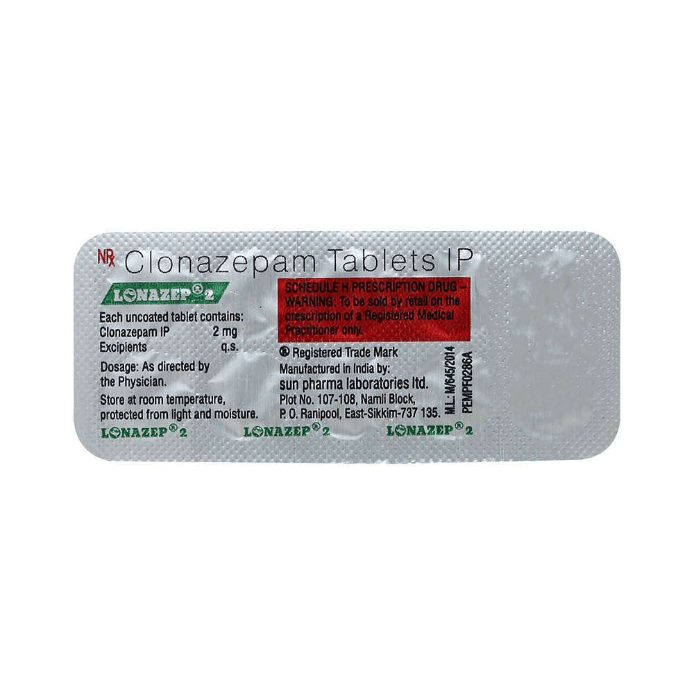 Lonazep 2mg Tablet is a prescription medicine used to treat epilepsy (seizures) and anxiety disorder. It helps to decrease the abnormal and excessive activity of the nerve cells and calms the brain. Lonazep 2mg Tablet may be taken with or without food. However, take it at the same time each day as this helps to maintain a consistent level of medicine in the body. Take this medicine in the dose and duration as advised by your doctor as it has a high potential of habit-forming. If you have missed a dose, take it as soon as you remember it and finish the full course of treatment even if you feel better. You should not stop this medicine suddenly without talking to your doctor as it may increase the seizure frequency and can cause nausea, anxiety, flu-like symptoms, and muscle pain.Some common side effects of this medicine include fatigue, depression and impaired coordination. It may also cause dizziness and sleepiness, so do not drive or do anything that requires mental focus until you know how this medicine affects you. It is important to inform your doctor if you develop any unusual changes in mood or depression as this medicine may cause suicidal thoughts.