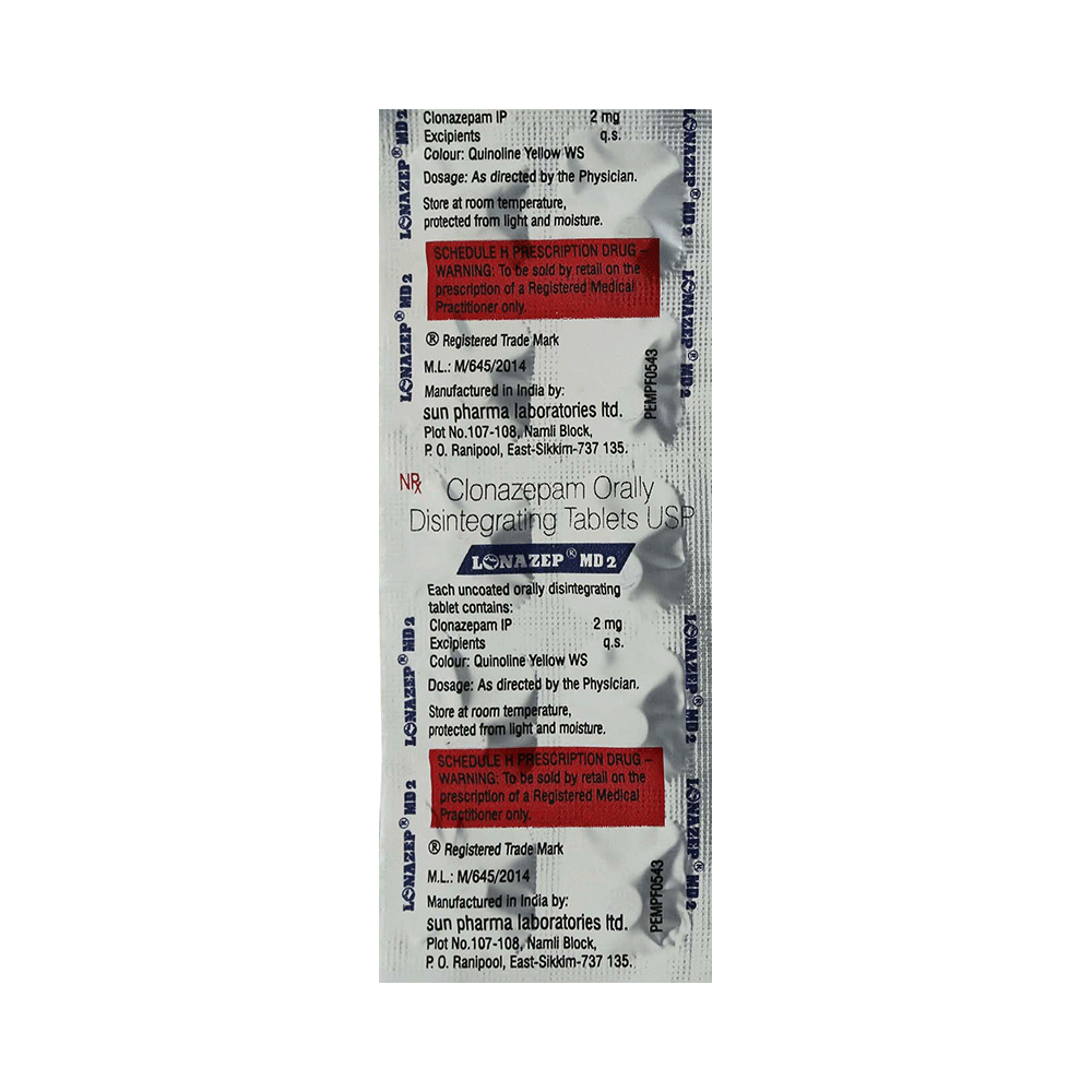 Lonazep 2mg Tablet MD is a prescription medicine used to treat epilepsy (seizures) and anxiety disorder. It helps to decrease the abnormal and excessive activity of the nerve cells and calms the brain. Lonazep 2mg Tablet MD may be taken with or without food. However, take it at the same time each day as this helps to maintain a consistent level of medicine in the body. Take this medicine in the dose and duration as advised by your doctor as it has a high potential of habit-forming. If you have missed a dose, take it as soon as you remember it and finish the full course of treatment even if you feel better. You should not stop this medicine suddenly without talking to your doctor as it may increase the seizure frequency and can cause nausea, anxiety, flu-like symptoms, and muscle pain.Some common side effects of this medicine include fatigue, depression and impaired coordination. It may also cause dizziness and sleepiness, so do not drive or do anything that requires mental focus until you know how this medicine affects you. It is important to inform your doctor if you develop any unusual changes in mood or depression as this medicine may cause suicidal thoughts.