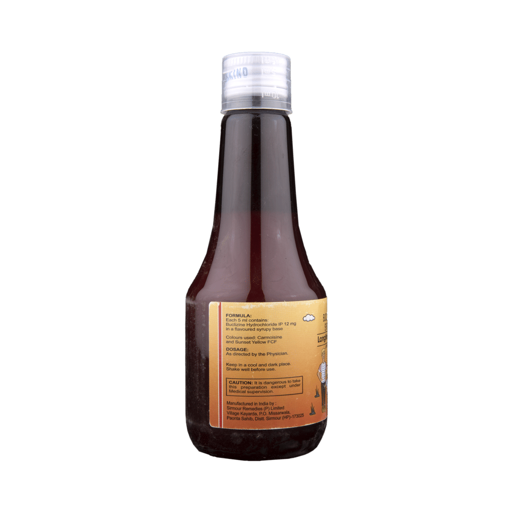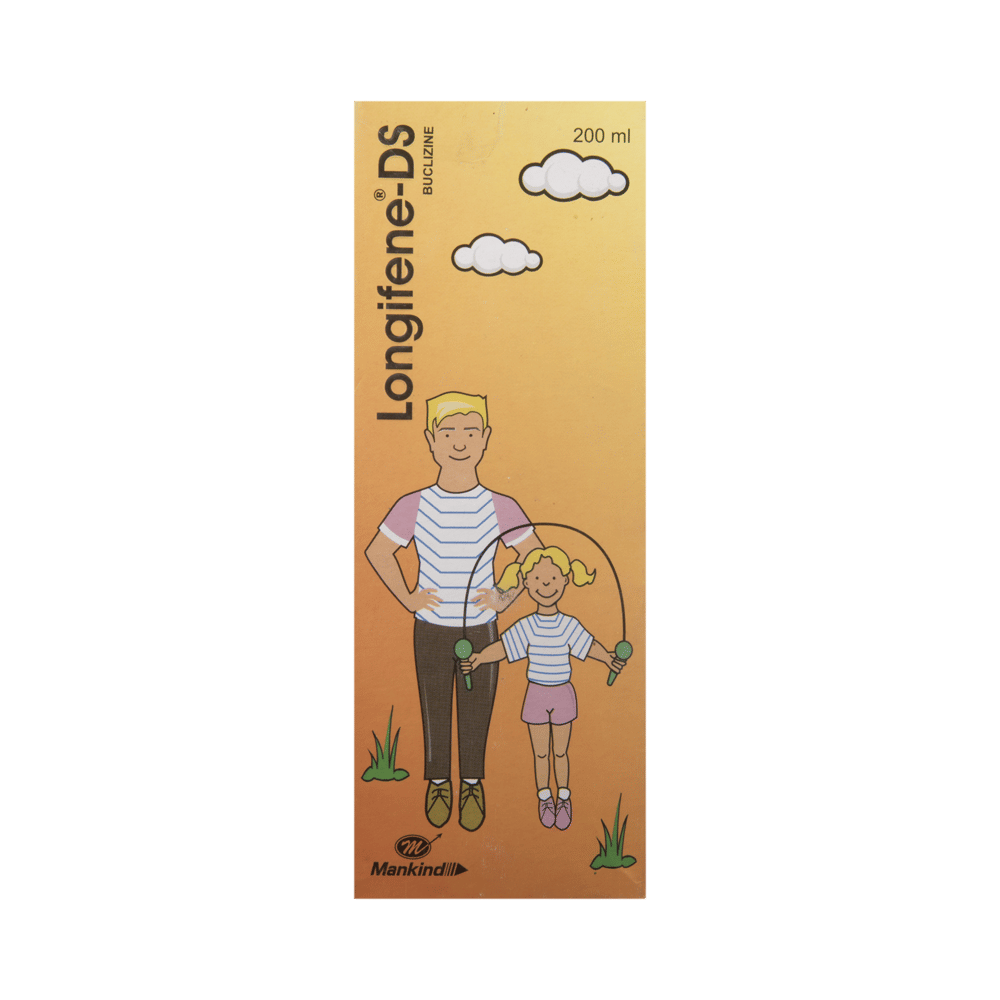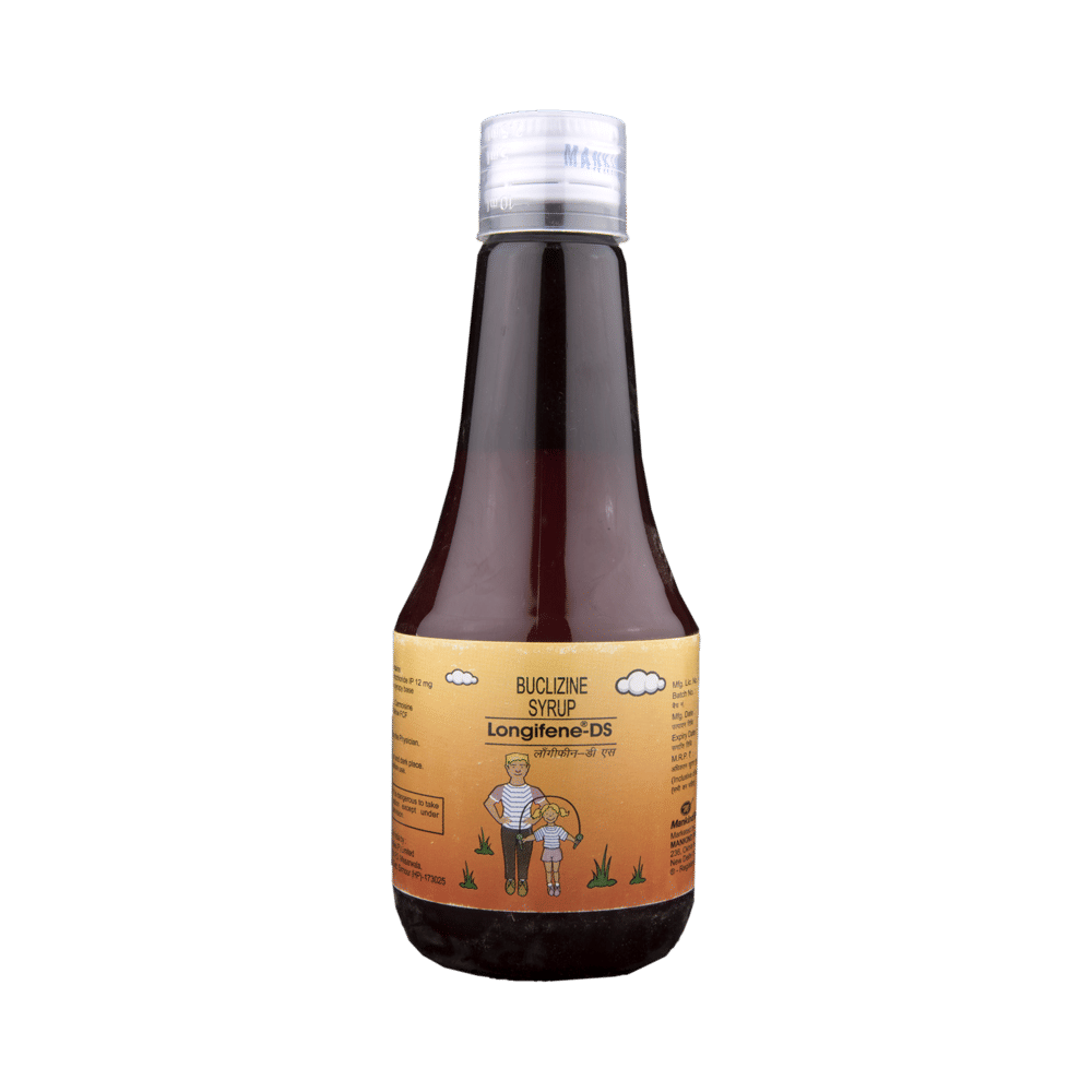 Longifene-DS Syrup is a prescription medicine used to treat various allergic conditions such as conjunctivitis and urticaria. It is also used for prevention and treatment of nausea or vomiting associated with motion sickness. Longifene-DS Syrup should be taken immediately after food or preferably one hour before you travel. It should be taken as your doctor's advice. The dose and how often you take it depends on what you are taking it for. Your doctor will decide how much you need to improve your symptoms. In case, you have missed any doses then it is better to take the next dose as soon as you remember it. However, you should never take a double dose.Sleepiness is the most common side effect of this medicine. Avoid driving or attention-seeking activity. If these bother you or appear serious, let your doctor know. There may be ways of reducing or preventing them. In some cases, it may cause dryness of the mouth, so it is advised to drink more water, always carry sugar candy or maintain oral hygiene.Before taking this medicine, let your doctor know if you have glaucoma or have any gastro-related issues. Inform your doctor if you are pregnant, or breastfeeding. Your doctor should also know about all other medicines you are taking as many of these may make this medicine less effective or change the way it works. Generally, it is advised to avoid alcohol while on treatment.
