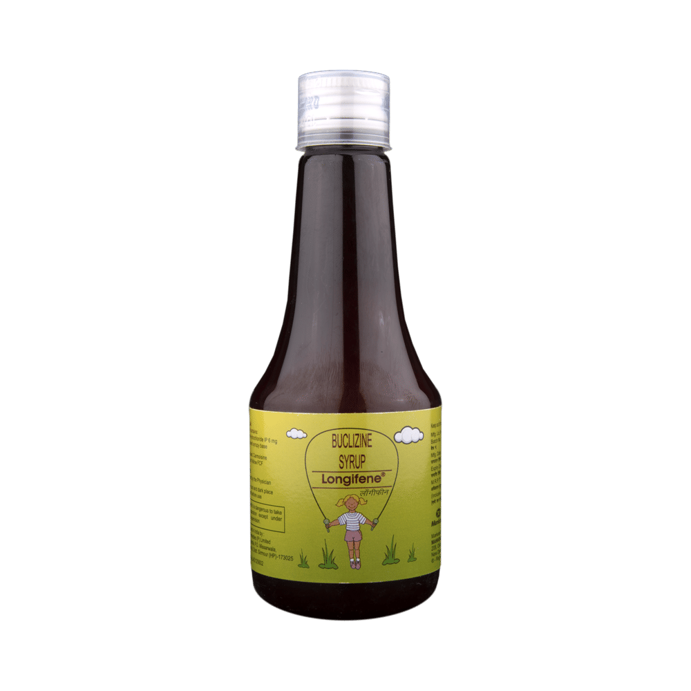 Longifene Syrup is a prescription medicine used to treat various allergic conditions such as conjunctivitis and urticaria. It is also used for prevention and treatment of nausea or vomiting associated with motion sickness. Longifene Syrup should be taken immediately after food or preferably one hour before you travel. It should be taken as your doctor's advice. The dose and how often you take it depends on what you are taking it for. Your doctor will decide how much you need to improve your symptoms. In case, you have missed any doses then it is better to take the next dose as soon as you remember it. However, you should never take a double dose.Sleepiness is the most common side effect of this medicine. Avoid driving or attention-seeking activity. If these bother you or appear serious, let your doctor know. There may be ways of reducing or preventing them. In some cases, it may cause dryness of the mouth, so it is advised to drink more water, always carry sugar candy or maintain oral hygiene.Before taking this medicine, let your doctor know if you have glaucoma or have any gastro-related issues. Inform your doctor if you are pregnant, or breastfeeding. Your doctor should also know about all other medicines you are taking as many of these may make this medicine less effective or change the way it works. Generally, it is advised to avoid alcohol while on treatment.