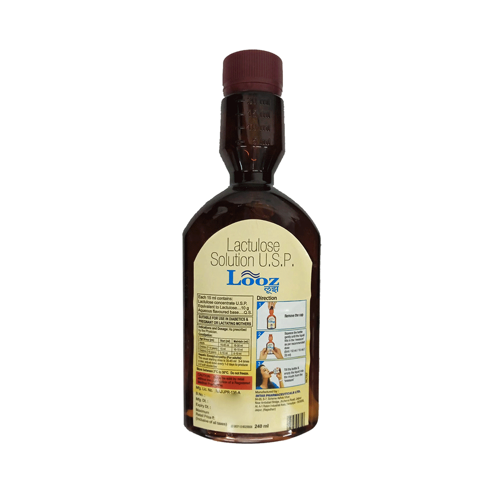 Looz Oral Solution is a type of sugar used to treat constipation. It is known as a laxative and makes your stool easier to pass by drawing water into your bowel. It is also used to treat hepatic encephalopathy (a liver disease causing confusion, tremor, decreased level of consciousness). Looz Oral Solution can be taken with or without food. You should take this medicine as advised by your doctor. Use this medicine regularly to get the maximum benefit and try to take it at the same time(s) each day. Your dose may go up or down depending on how well it is working. Do not take more than you are advised to and, if you miss a dose, do not take an extra one to make up for it. This medicine takes at least 48 hours to work. Talk to your doctor if you are still constipated after 3 days.The most common side effects are nausea and vomiting. These are usually mild and go away after a couple of days. Occasionally people develop serious side effects including severe diarrhea and electrolyte imbalance. Talk to your doctor straight away if you notice any of these.Before taking this medicine, you should tell your doctor if you have diabetes or if you are unable to digest milk sugar (lactose intolerant). If you use this medicine over a long period of time, your doctor may want you to have occasional blood tests to check the mineral levels (e.g. potassium and sodium). Do not take other laxative medicines while taking this medicine and check with your doctor if you are pregnant or breastfeeding.