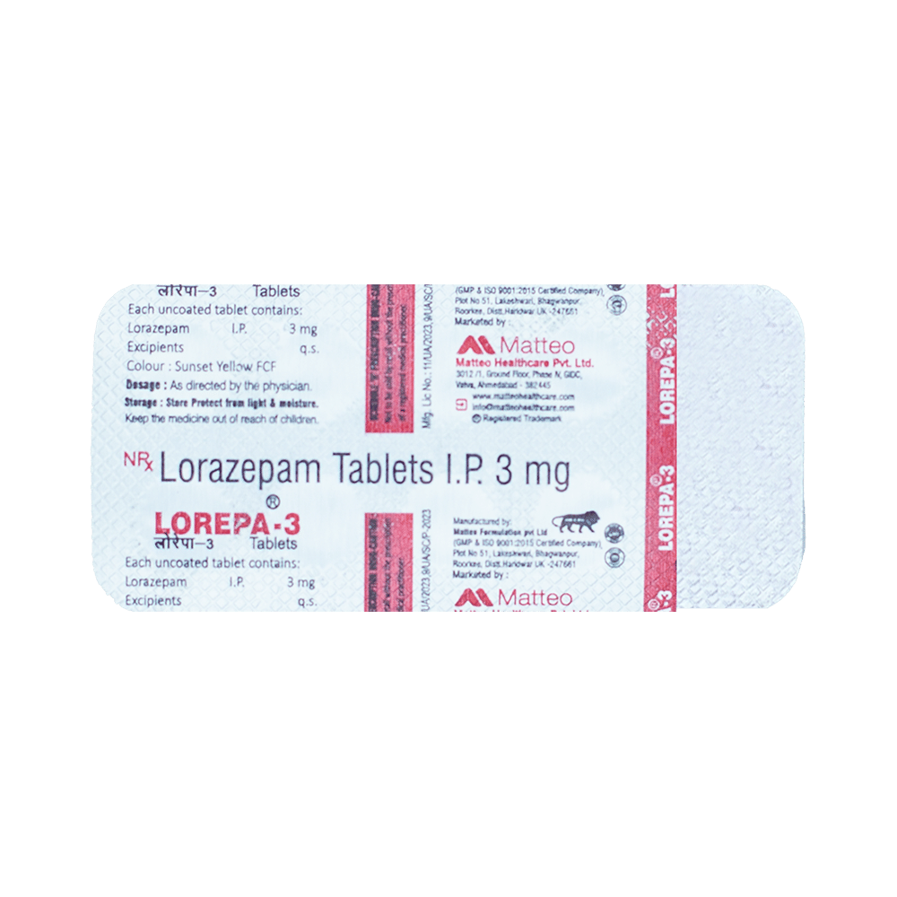 Lorepa Tablet 3 is a prescription medicine used to treat anxiety disorders such as generalized anxiety disorder (excessive worry or restlessness), obsessive-compulsive disorder (OCD), panic attacks, and social phobias. It is also used for the short-term relief of the symptoms of anxiety. Lorepa Tablet 3 relieves symptoms of anxiety such as nervousness, rapid breathing, increased heart rate, excessive sweating, trembling, weakness or lack of concentration. It may be taken with or without food. However, take it at the same time each day as this helps to maintain a consistent level of medicine in the body. Take this medicine in the dose and duration as advised by your doctor as it has a high potential of habit-forming.If you have missed any doses, take it as soon as you remember it and finish the full course of treatment even if you feel better. You should not stop this medication without talking to your doctor as it may cause nausea and anxiety.The most common side effects of this medicine are weakness, sedation, and balance disorder (loss of balance). It may also cause dizziness and sleepiness, so do not drive or do anything that requires mental focus until you know how this medicine affects you. Talk to your doctor about potential side effects and ways you might prevent or cope with them. You may also get side effects after stopping the treatment.Before taking the medicine you should tell your doctor if you are pregnant, planning to become pregnant, or breastfeeding. Taking it along with alcohol affects the way it works and can increase the chance of side effects. If you have been taking this medicine for a long time then regular monitoring of blood and liver functions may be required.