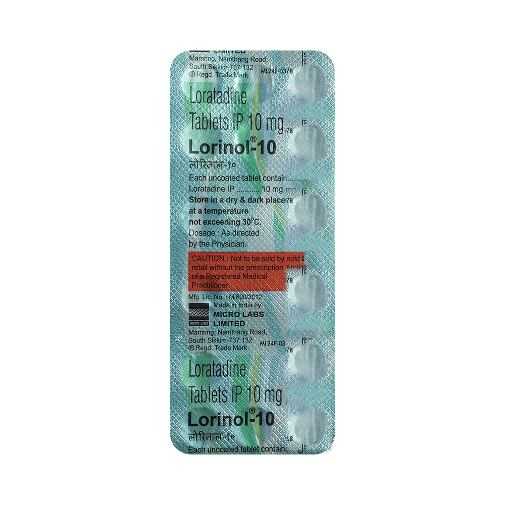 LORInol 10 Tablet belongs to a group of medicines called antihistamines. It is used in the treatment of various allergic conditions. It relieves symptoms like itching, swelling, and rashes. LORInol 10 Tablet should be taken on an empty stomach. The dose may vary depending on what you are taking it for. Take it as it has been prescribed by your doctor. You may need this medicine only on days you have symptoms, or you may need to take it every day to prevent symptoms from happening. If you stop taking it earlier than advised, your symptoms may come back. This medicine is generally very safe.As compared to other similar medications, it is much less likely to make you feel sleepy. But, it may cause some amount of dizziness, so do not drive or do anything that needs attention. Consult your doctor if it persists or worries you. It may also cause headaches, fatigue, dry mouth, and increase appetite in some cases. Before taking it, you should tell your doctor if you have any problems with your liver or kidneys or with your heart.Pregnant or breastfeeding women should also consult with their doctor before taking it. Avoid drinking alcohol as it can cause excessive drowsiness with this medicine.