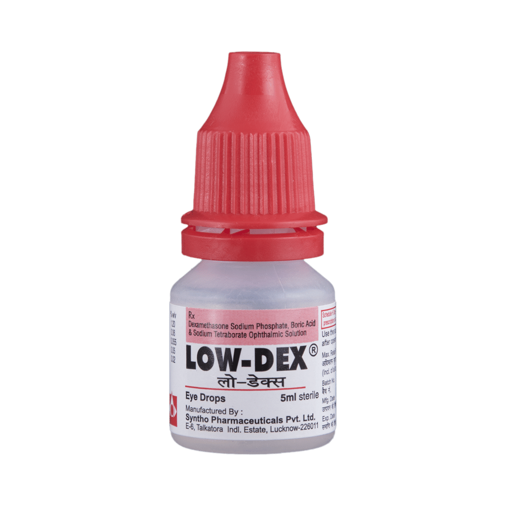 Low-Dex Eye Drops belongs to a group of medicines called steroids. It is used in the treatment of eye infections. It reduces the redness and swelling caused by infections, allergies, and injuries. It is sometime used after eye surgery. Never use Low-Dex Eye Drops if the seal is broken before you use it for the first time. Wash your hands before using it and shake the bottle well before each use. Make sure you remove contact lenses if you wear them and wait for at least 15 minutes before putting them back.You should not discontinue using the medicine unless your doctor tells you so. Stopping the medication before time may allow the bacteria to continue their growth, which may result in the return of the infection.It may cause eye irritation, blurred vision, and bitter taste in the mouth. These side effects are usually temporary and resolve with time. If your vision is blurred or you have other changes in sight for a time, do not drive or operate other machines until your vision is clear. If you are pregnant or breastfeeding, you should consult with your doctor before using this medicine.