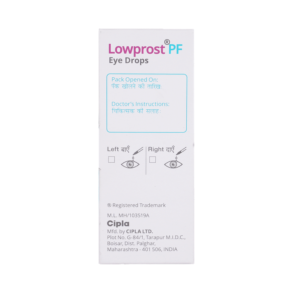 In GlaucomaLowprost PF 0.01% Eye Drop helps reduce pressure in your eyes (ocular hypertension) that can lead to an illness called glaucoma. It may be used alone or with other eye drops. Do not use it too often as that can make it less effective. You should only use it in the affected eye and take it regularly as prescribed by your doctor. If you stop taking it, the pressure in your eye will not be controlled. This could lead to a loss of sight.In Ocular hypertensionLowprost PF 0.01% Eye Drop belongs to a group of medicines called prostaglandin analogue. It is used to reduce pressure in your eyes. It increases the flow of fluid from inside the eye into the bloodstream thereby lowering the increased eye pressure. If the pressure in your eye is too high, it can damage your sight. Take it regularly as prescribed by your doctor. If you stop taking it, the pressure in your eye will not be controlled.show moreshow less