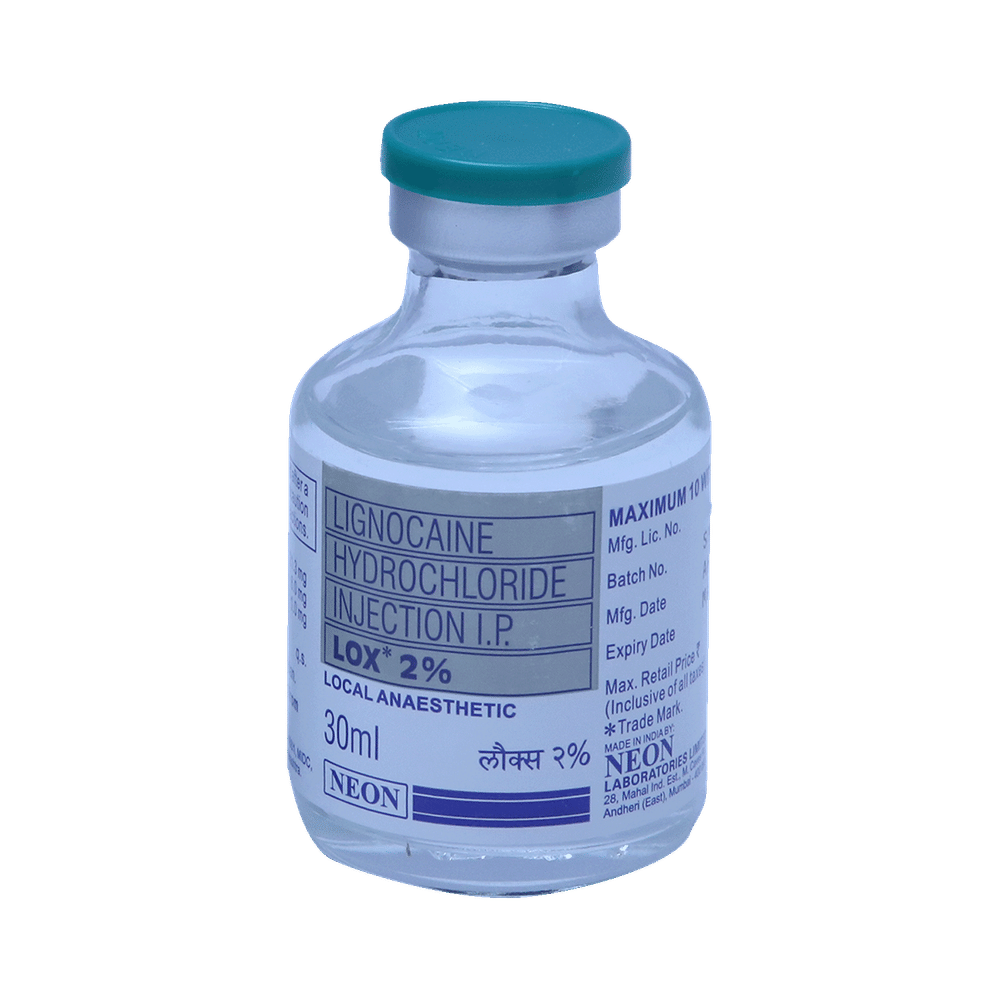 Lox 2% Injection is a local anesthetic. It is used during minor surgical procedures such as dental, oral, diagnostic, or other therapeutic procedures to anesthetize or numb the surgical area. Lox 2% Injection must be administered by healthcare professionals. It blocks the pain signals to reach the brain by temporarily numbing the surgical area and helps to perform a painless procedure.This medicine is generally safe with little or no side effects. However, it may cause injection site reactions, such as pain, swelling, and redness, in some people. These are usually mild and short-lived. If the numbness or other side effects persist at the injection site, consult your doctor without any delay.Before using Lox 2% Injection, it is very important to tell your doctor if you have any underlying heart disease or are taking medicines for heart rhythm problems. Ask your doctor for advice if you are pregnant or breastfeeding. Also, the medicine may cause dizziness. So avoid driving or operating heavy machinery while on medication.