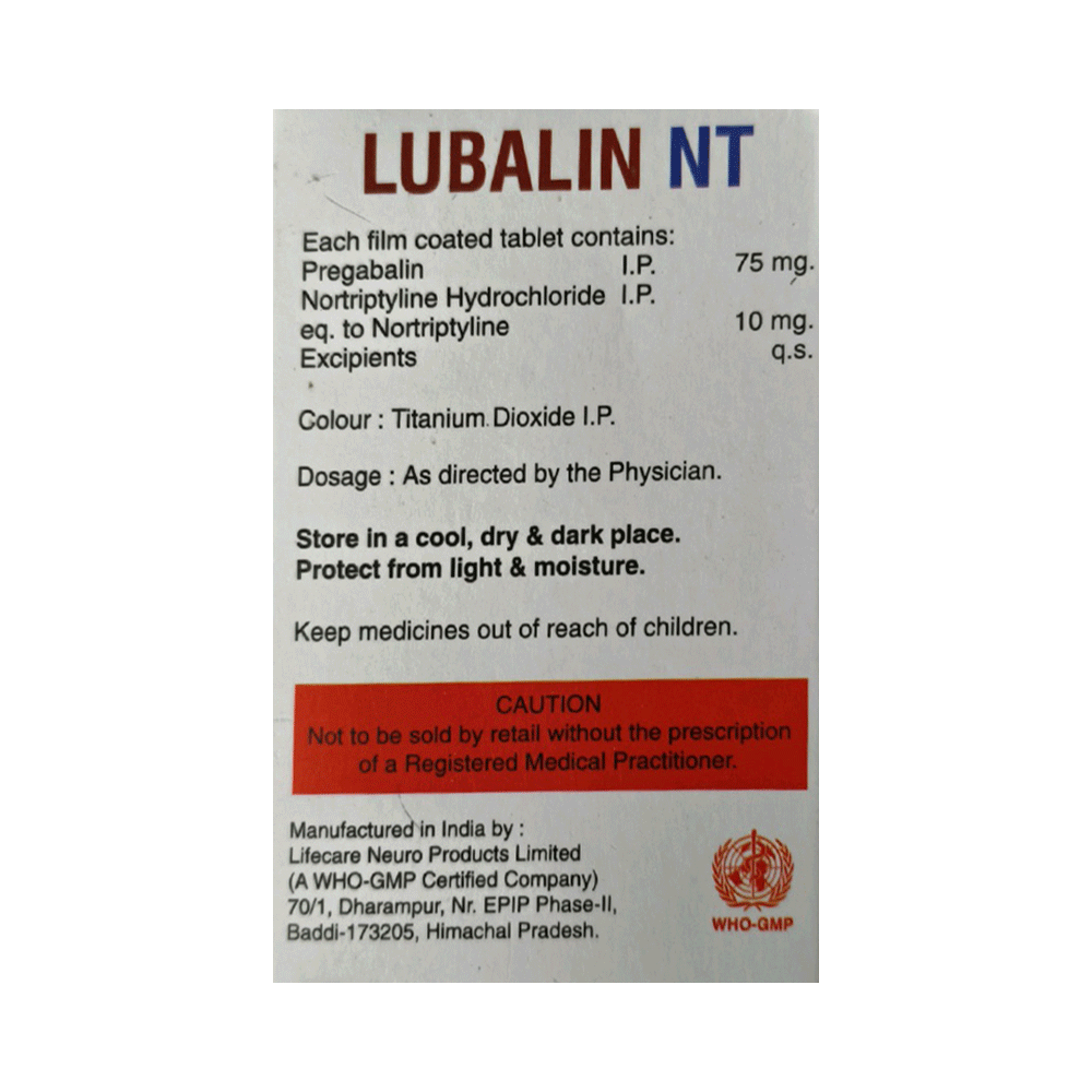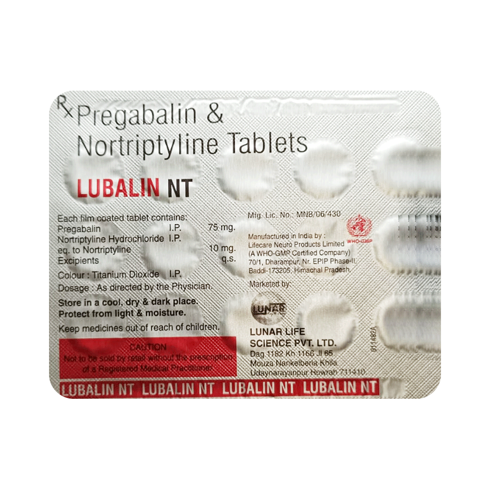 Lubalin NT Tablet is a combination of two medicines: Pregabalin and Nortriptyline. Pregabalin is an alpha-2 delta ligand that decreases pain by modulating the calcium channel activity of the nerve cells. Nortriptyline is a tricyclic antidepressant that increases the levels of chemical messengers (serotonin and noradrenaline) that stop the movement of pain signals in the brain. Together, they relieve neuropathic pain (pain from damaged nerves).