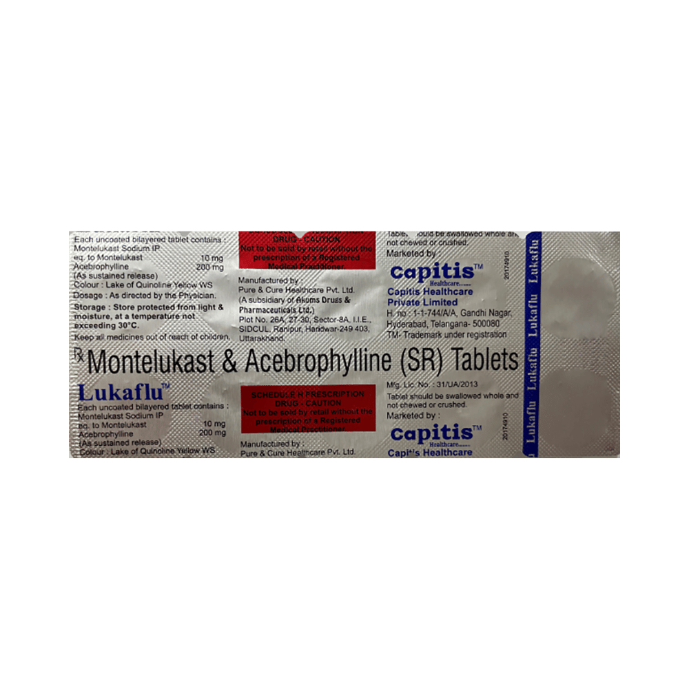 Lukaflu Tablet SR helps prevent and treat asthma and chronic obstructive pulmonary disorder (COPD). It helps relax the muscles of the air passages, thereby making it easier to breathe. It is also used to treat bronchitis. Lukaflu Tablet SR is taken with or without food in a dose and duration as advised by the doctor. The dose you are given will depend on your condition and how you respond to the medicine. You should keep taking this medicine for as long as your doctor recommends. If you stop treatment too early, your symptoms may come back, and your condition may worsen. Let your healthcare team know about all other medications you are taking, as some may affect or be affected by this medicine.The most common side effects are vomiting, heartburn, stomach pain, rash, itching, and breathing difficulty. Most of these are temporary and usually resolve with time. Contact your doctor straight away if you are at all concerned about any of these side effects. This medicine may also cause dizziness and sleepiness, so do not drive or do anything that requires mental focus until you know how this medicine affects you. Avoid drinking alcohol while taking this medicine, as it can worsen your sleepiness.Before taking it, you should tell your doctor if you have any kidney or liver diseases so that your doctor can prescribe a suitable dose for you. You should also tell your doctor if you are pregnant, planning pregnancy, or breastfeeding.