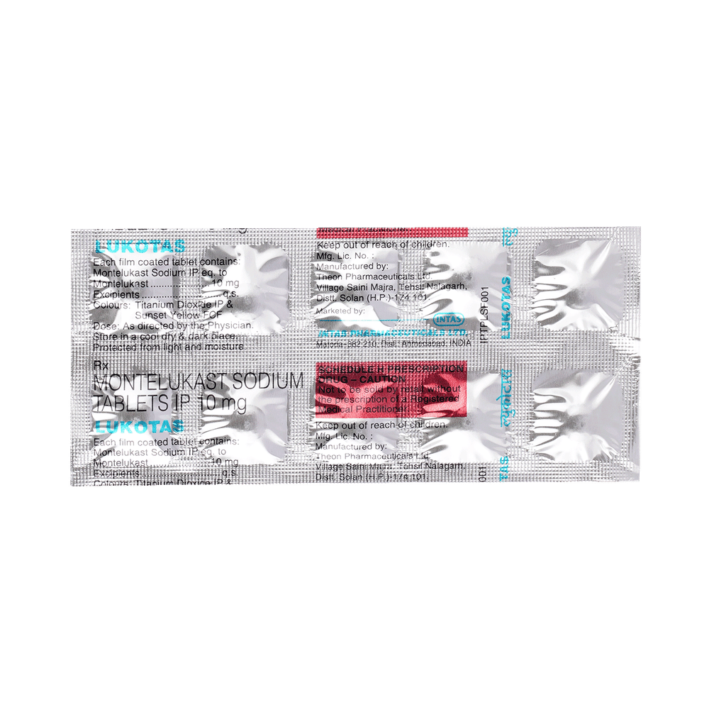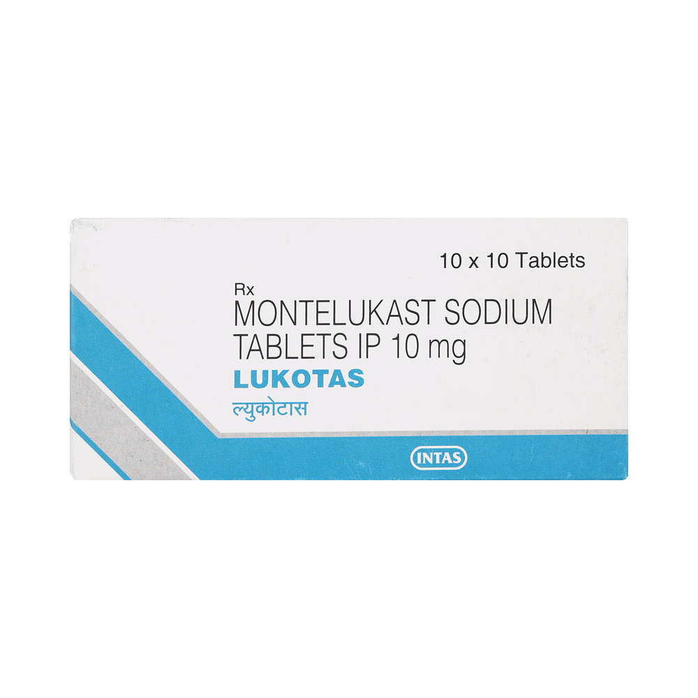 Lukotas 10mg Tablet is a prescription medicine used for asthma prevention and for the treatment of allergy symptoms such as sneezing and runny nose. It reduces inflammation in the airways and makes breathing easier. Lukotas 10mg Tablet can be taken with or without food. Take it at the same time to get the most benefit. It is advised to have it 2 hours before exercise if you have exercise-induced asthma. It should be taken as your doctor's advice. The dose and how often you take it depends on what you are taking it for. Your doctor will decide how much you need to improve your symptoms. You should take this medicine for as long as it is prescribed for you. It does not cure sudden breathing problems, so always carry a medicated inhaler with you. It is generally safe medicine with few common side effects include nausea, vomiting, headache, abdominal pain, and diarrhea. If these bother you or appear serious, let your doctor know. There may be ways of reducing or preventing them. Generally, you should avoid alcohol while taking this medicine.Before taking this medicine, you should tell your doctor if you have ever had severe liver problems. Your doctor should also know about all other medicines you are taking as many of these may make this medicine less effective or change the way it works. You must inform your doctor about pregnancy or breastfeeding.