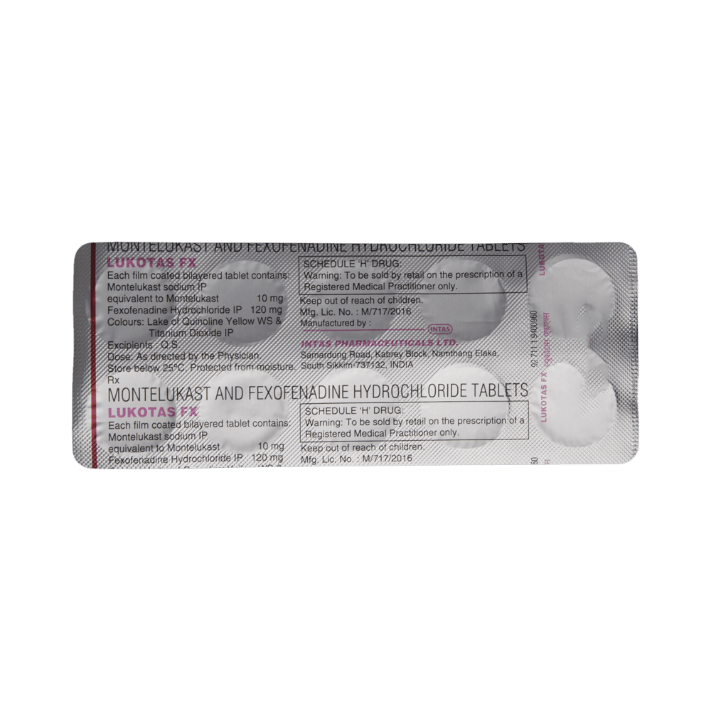 Lukotas FX Tablet is a combination medicine used in the treatment of allergy symptoms such as runny nose, stuffy nose, sneezing, watery eyes, and congestion or stuffiness. Lukotas FX Tablet is taken with or without food in a dose and duration as advised by the doctor. The dose you are given will depend on your condition and how you respond to the medicine. You should keep taking this medicine for as long as your doctor recommends. If you stop treatment too early your symptoms may come back and your condition may worsen. Let your healthcare team know about all other medications you are taking as some may affect, or be affected by this medicine.The most common side effects include nausea, diarrhea, vomiting, skin rash, flu-like symptoms, and headache. Most of these are temporary and usually resolve with time. Contact your doctor straight away if you are at all concerned about any of these side effects. This medicine may cause dizziness and sleepiness, so do not drive or do anything that requires mental focus until you know how this medicine affects you. Avoid drinking alcohol while taking this medicine as it can worsen your sleepiness.Never support self-medication or recommend your medicine to another person. It is beneficial to have plenty of fluids while taking this medication. Before you start taking this medicine it is important to inform your doctor if you are suffering from liver or kidney disease. You should also tell your doctor if you are pregnant, planning pregnancy or breastfeeding.