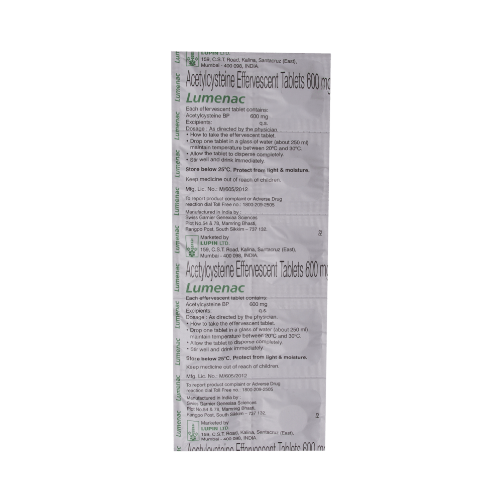 Lumenac Effervescent Tablet Orange is a mucolytic medication. It works by thinning the mucus (phlegm) making it easier to cough out. Thus, it clears the air passages and makes breathing easier. It also has antioxidant action.