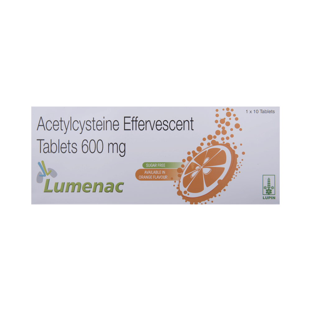 Lumenac Effervescent Tablet Orange is a prescription medicine used in the treatment of respiratory disease with excessive mucus. This medicine helps reduces mucus secretion in various lung diseases such as bronchitis, asthma, and emphysema. Lumenac Effervescent Tablet Orange can be taken with or without food, but take it at the same time to get the most benefit. It should be taken as your doctor's advice. The dose and how often you take it depends on what you are taking it for. Your doctor will decide how much you need to improve your symptoms. Dissolve the tablet in a glass of water and drink it immediately. Take this medicine for as long as it is prescribed for you.The most common side effects of this medicine include fever, nausea, vomiting, rash, and gastrointestinal discomfort. If these bother you or appear serious, let your doctor know. There may be ways of reducing or preventing them. Generally, it is advised to drink plenty of fluids while on treatment with this medicine.Before taking this medicine let your doctor know if you suffer from asthma, as close monitoring is required while taking this medicine. Your doctor should also know about all other medicines you are taking as many of these may make this medicine less effective or change the way it works. Inform your doctor if you are pregnant, planning a pregnancy, or breastfeeding.