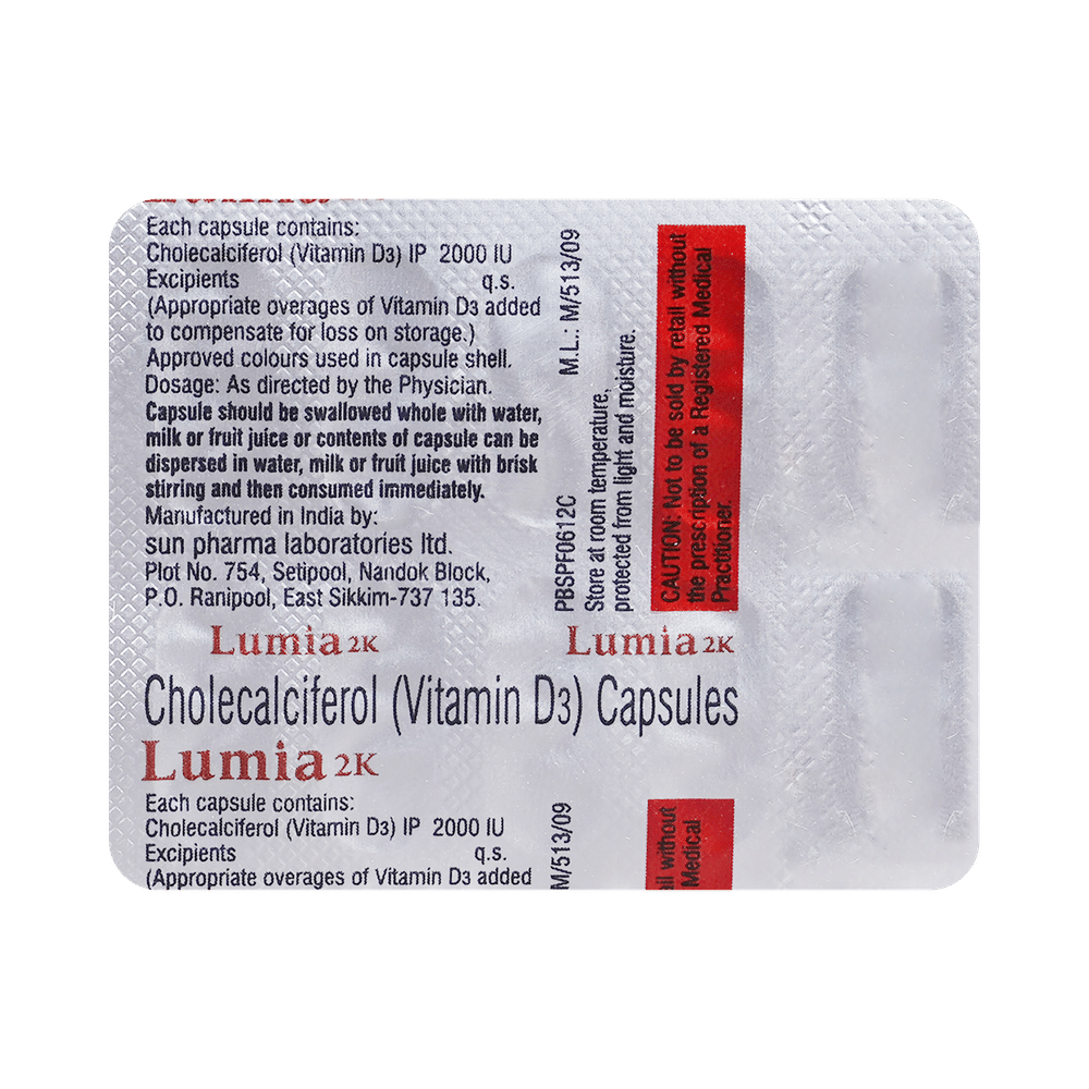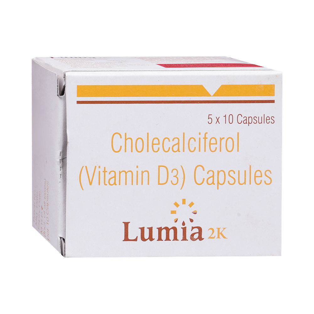Lumia 2K Capsule is used in the treatment of vitamin D deficiency and osteoporosis. It helps the body to absorb calcium. Calcium is essential for maintaining strong and healthy bones. It is used when your diet does not provide enough calcium. Lumia 2K Capsule should be taken as directed by your doctor. It is best taken with or after food, as this helps your body absorb it, and you should take it regularly to get the most benefits. If you are using it to treat osteoporosis, you will also be prescribed other medicines. This medicine may be only part of a complete treatment program that includes making changes to your diet and taking calcium and vitamin supplements. Learn about the foods you should eat to ensure you get enough calcium and vitamin D.Lumia 2K Capsule has few side effects, and none are common. If you take too much, you may feel weakness, muscle pain, or a metallic taste in your mouth. If you experience any such side effects, speak with your doctor. They may be able to help you reduce or treat the symptoms.Before taking this medicine, tell your doctor if you have high calcium levels in your blood or if you have any heart, kidney, or liver disease. Some other medicines can decrease the absorption of vitamin D3, so let your doctor know about all the other medicines you are taking to make sure you are safe. This medicine may help during pregnancy when your body needs more vitamin D, but too much could harm your baby. Discuss it with your doctor.