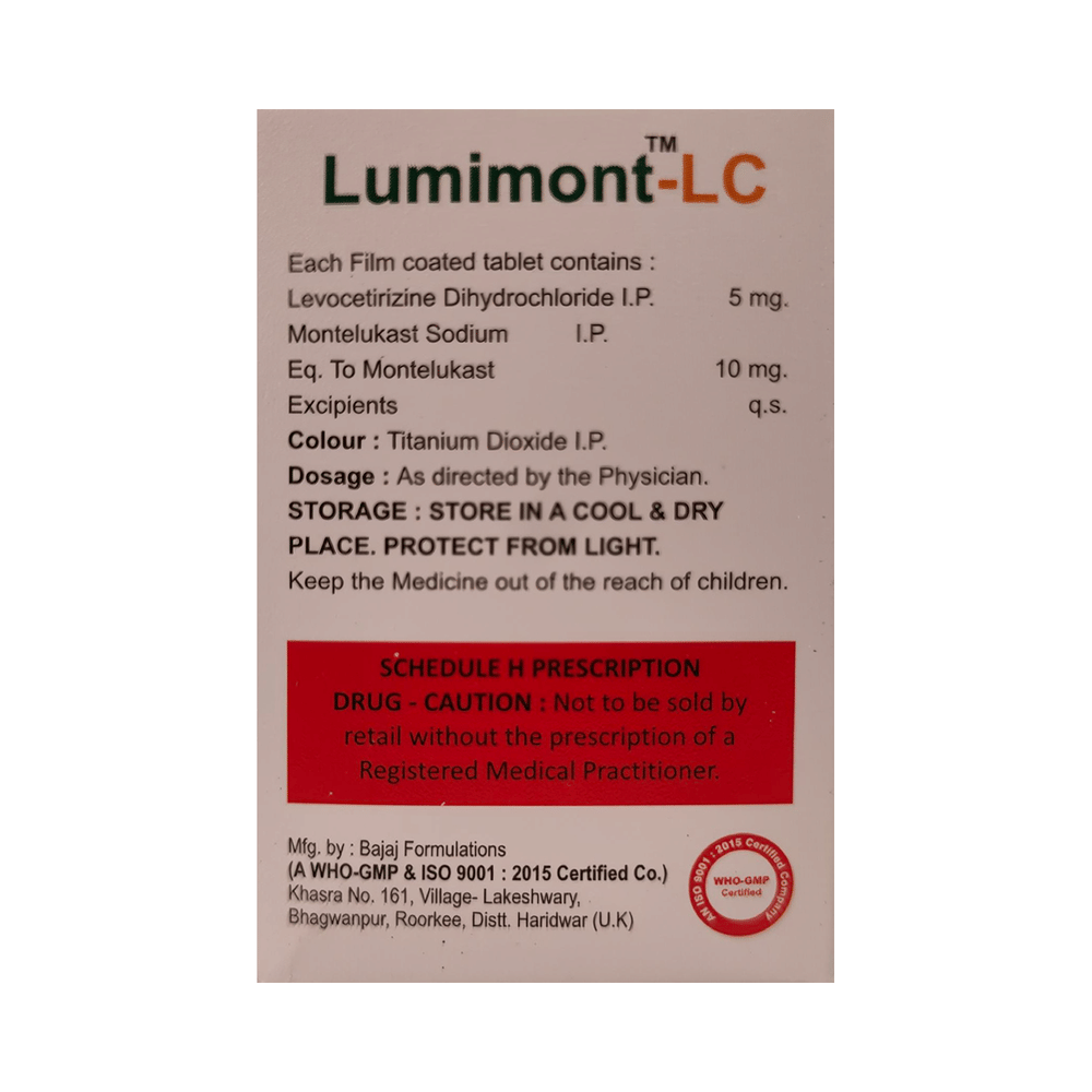 In Treatment of Allergic skin conditionsLumimont-LC Tablet is effective in treating allergic skin conditions with inflammation and itching. It reduces the actions of chemicals in the body that cause inflammation of the skin. When used correctly it is a safe and effective treatment. It reduces the redness, rash, pain or itchiness caused by your skin’s reaction to an irritant. It thus improves your self-esteem and confidence as your appearance changes. Keep taking it for as long as it is prescribed to get the full benefits.In Treatment of Sneezing and runny nose due to allergiesLumimont-LC Tablet is a combination medicine that provides relief from symptoms such as blocked or runny nose, sneezing and itchy or watery eyes. This will make it easier for you to go about your daily activities. It rarely has any serious side effects and you may only need to take it on days you have symptoms. If you are taking it to prevent getting symptoms you should use it regularly to get the most benefit.In Treatment of Hay feverHay fever, also called allergic rhinitis, causes cold-like signs and symptoms, such as a runny nose, itchy eyes, congestion, sneezing and sinus pressure. The only difference is that in hay fever, these symptoms are not produced due to a virus but are simply allergic responses of our body to allergens (allergy causing agents such as pollen). Lumimont-LC Tablet is used to provide relief from these symptoms of hay fever. It works by blocking the release of the chemical substance responsible for producing such allergy symptoms. Lumimont-LC Tablet is a safe medicine which helps treat hay fever and makes us feel at ease.show moreshow less