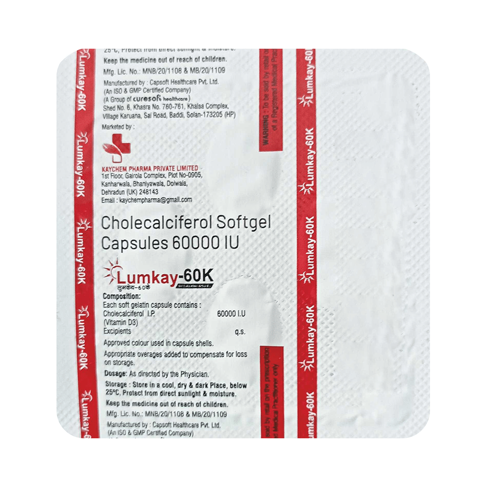 Lumkay 60K Softgel Capsule is a form of vitamin D. It raises vitamin D levels in your blood. This, in turn, increases calcium levels in your blood by helping you absorb more calcium from food.