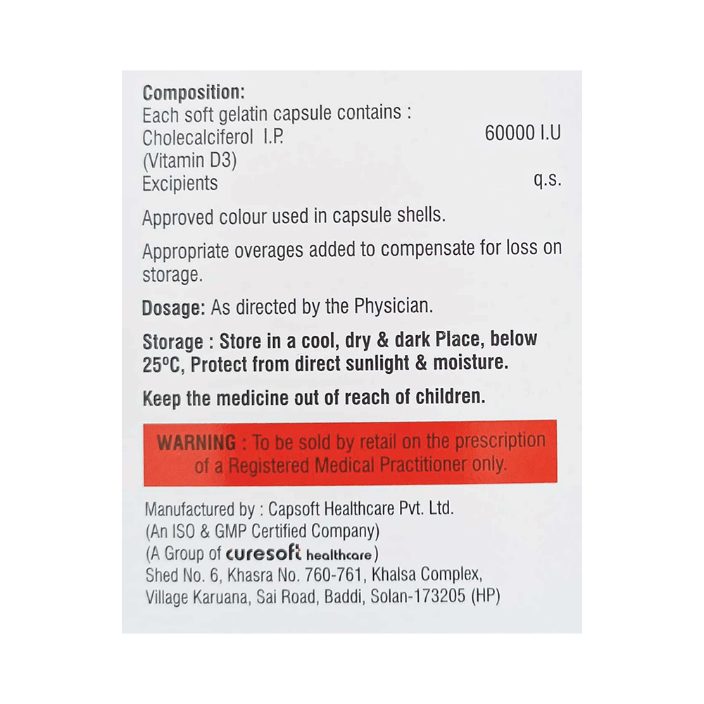 Lumkay 60K Softgel Capsule is used in the treatment of vitamin D deficiency and osteoporosis. It helps the body to absorb calcium. Calcium is essential for maintaining strong and healthy bones. It is used when your diet does not provide enough calcium. Lumkay 60K Softgel Capsule should be taken as directed by your doctor. It is best taken with or after food, as this helps your body absorb it, and you should take it regularly to get the most benefits. If you are using it to treat osteoporosis, you will also be prescribed other medicines. This medicine may be only part of a complete treatment program that includes making changes to your diet and taking calcium and vitamin supplements. Learn about the foods you should eat to ensure you get enough calcium and vitamin D.Lumkay 60K Softgel Capsule has few side effects, and none are common. If you take too much, you may feel weakness, muscle pain, or a metallic taste in your mouth. If you experience any such side effects, speak with your doctor. They may be able to help you reduce or treat the symptoms.Before taking this medicine, tell your doctor if you have high calcium levels in your blood or if you have any heart, kidney, or liver disease. Some other medicines can decrease the absorption of vitamin D3, so let your doctor know about all the other medicines you are taking to make sure you are safe. This medicine may help during pregnancy when your body needs more vitamin D, but too much could harm your baby. Discuss it with your doctor.